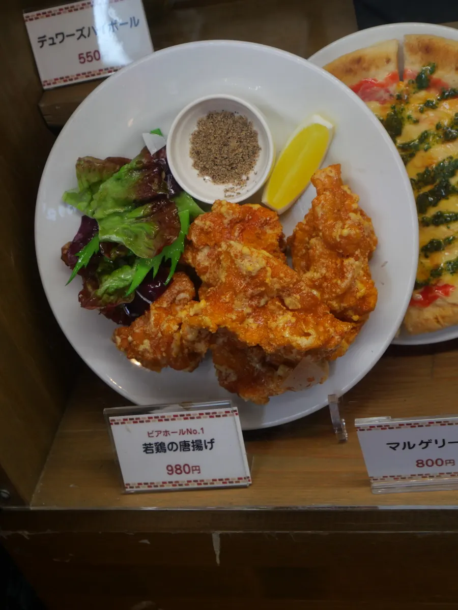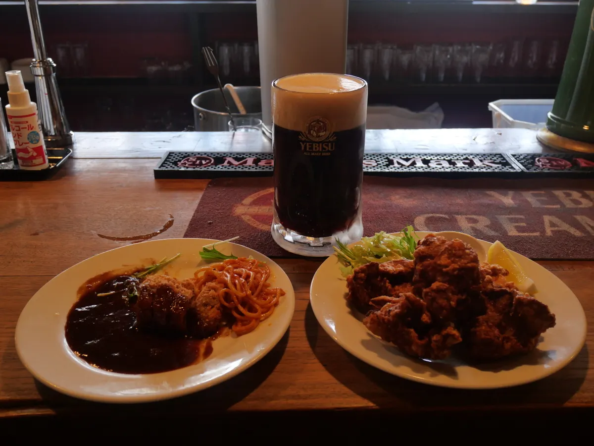 ←左 厚切りビフカツ ヱビスハーフ&ハーフ🍺 右→ 若鶏の唐揚げ