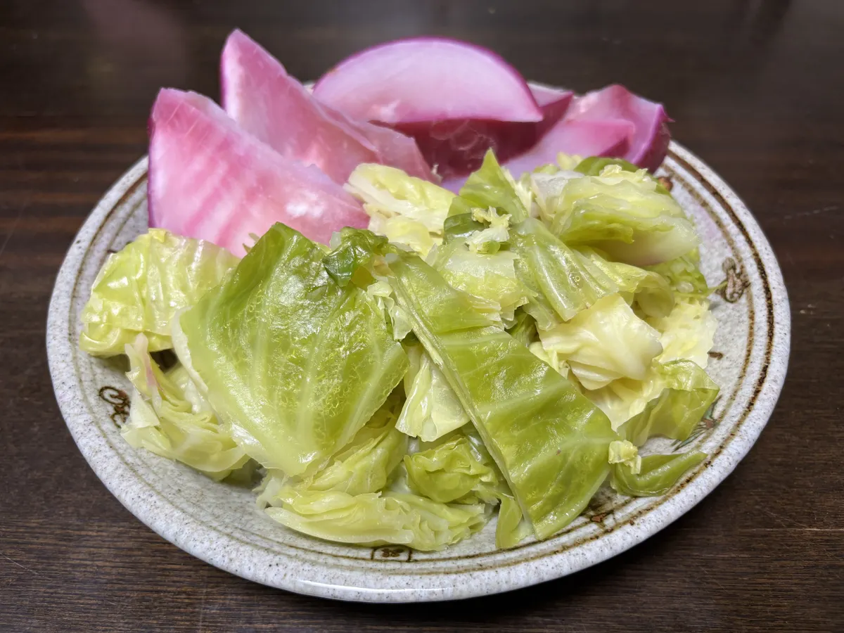 でも正直週末で料理が面倒になってきていたので、汁物は無しで付け合わせは蒸しキャベツと蕪でした。