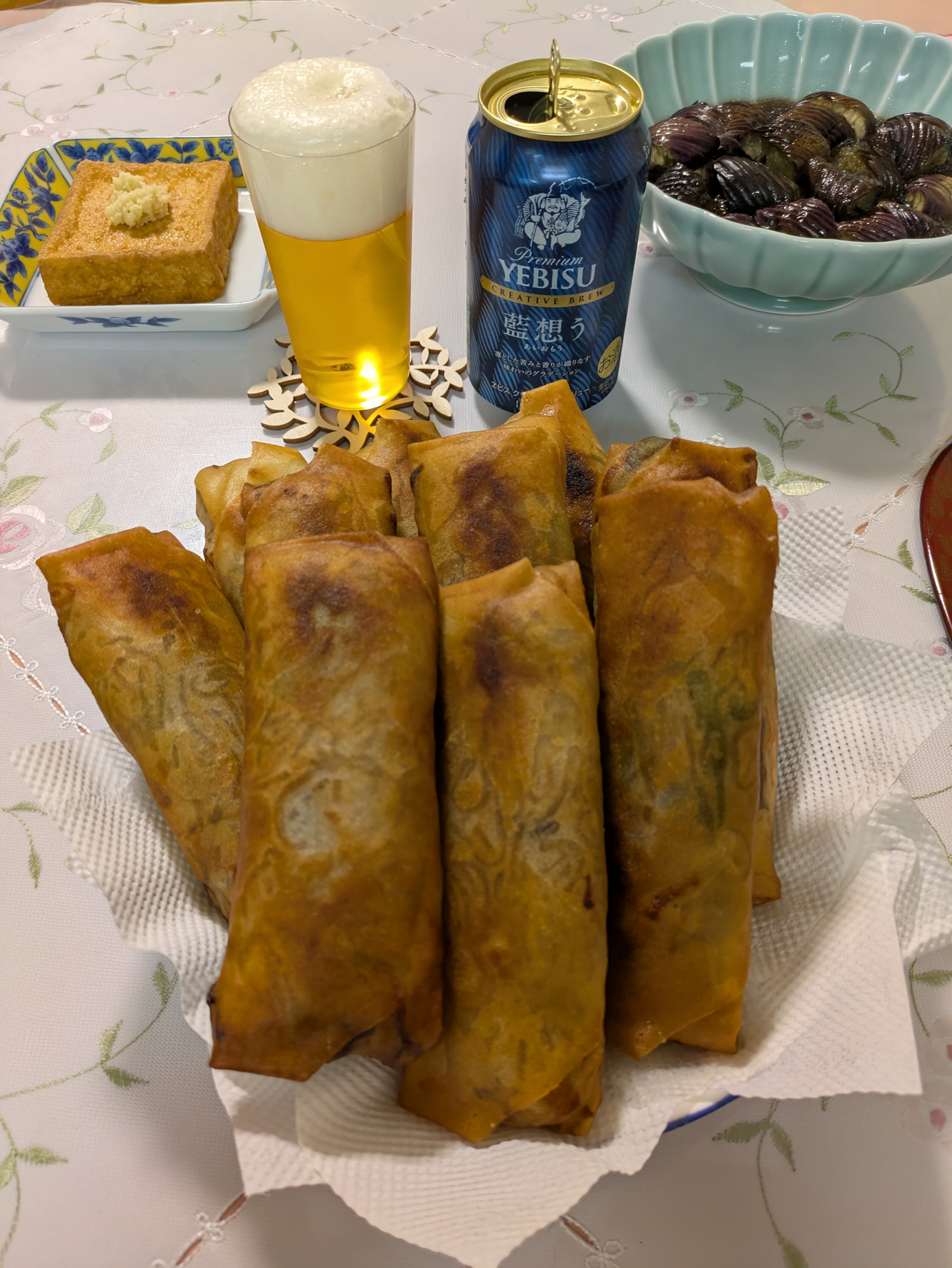春巻き、レンチン茄子の煮浸し、厚揚げをいただきました