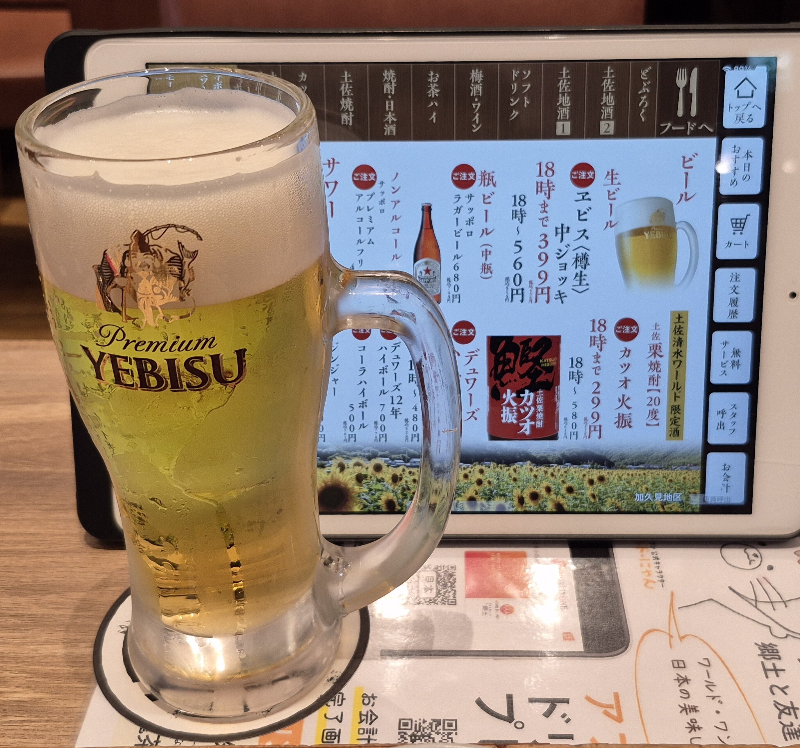 ↑↑↑ヱビス生ビール中ジョッキで399円(税抜ハッピーアワー価格)。