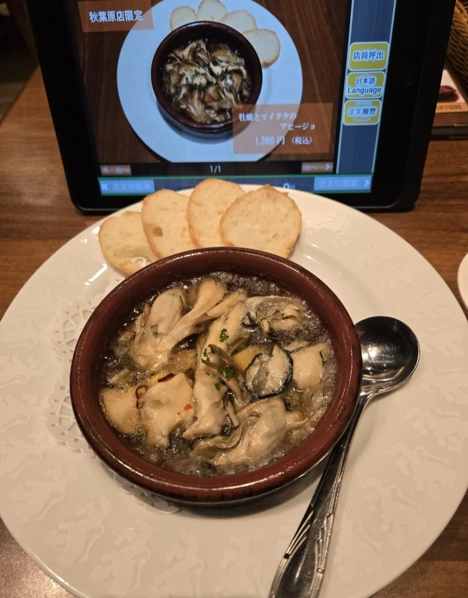 アテは店舗限定メニュー、牡蠣とマイタケのアヒージョ🦪