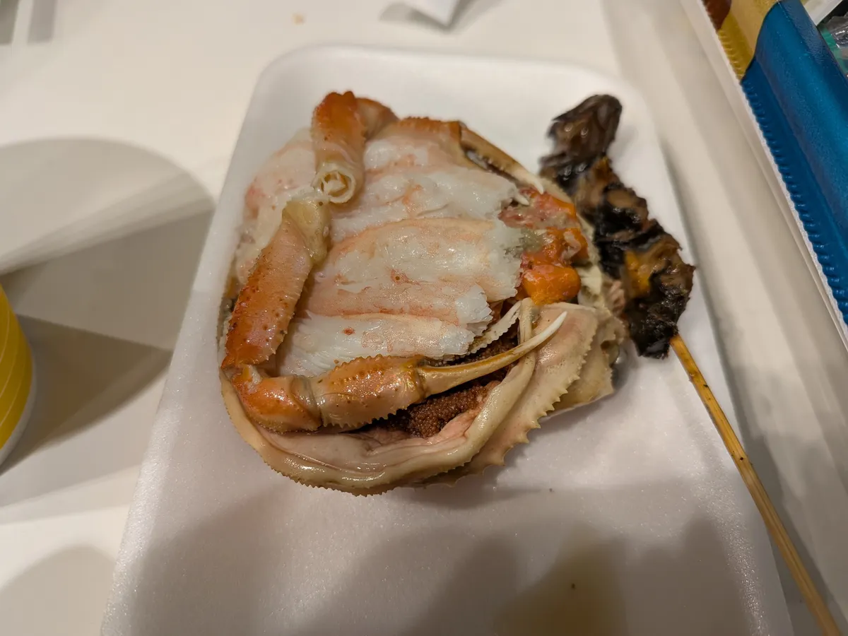 近江町市場で香箱カニ🦀とドジョウ串でエビスビール(紙コップ😅)を1杯堪能〜!🦀美味い〜!🤤