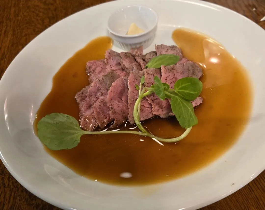 アテは料理長がホールでローストビーフを切り分ける日だったので、エンドカットを1枚注文🐮