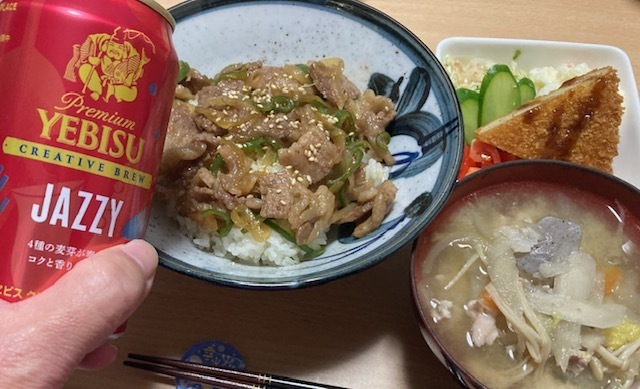 ゆうべは焼き肉丼、豚汁・サラダとJAZZY