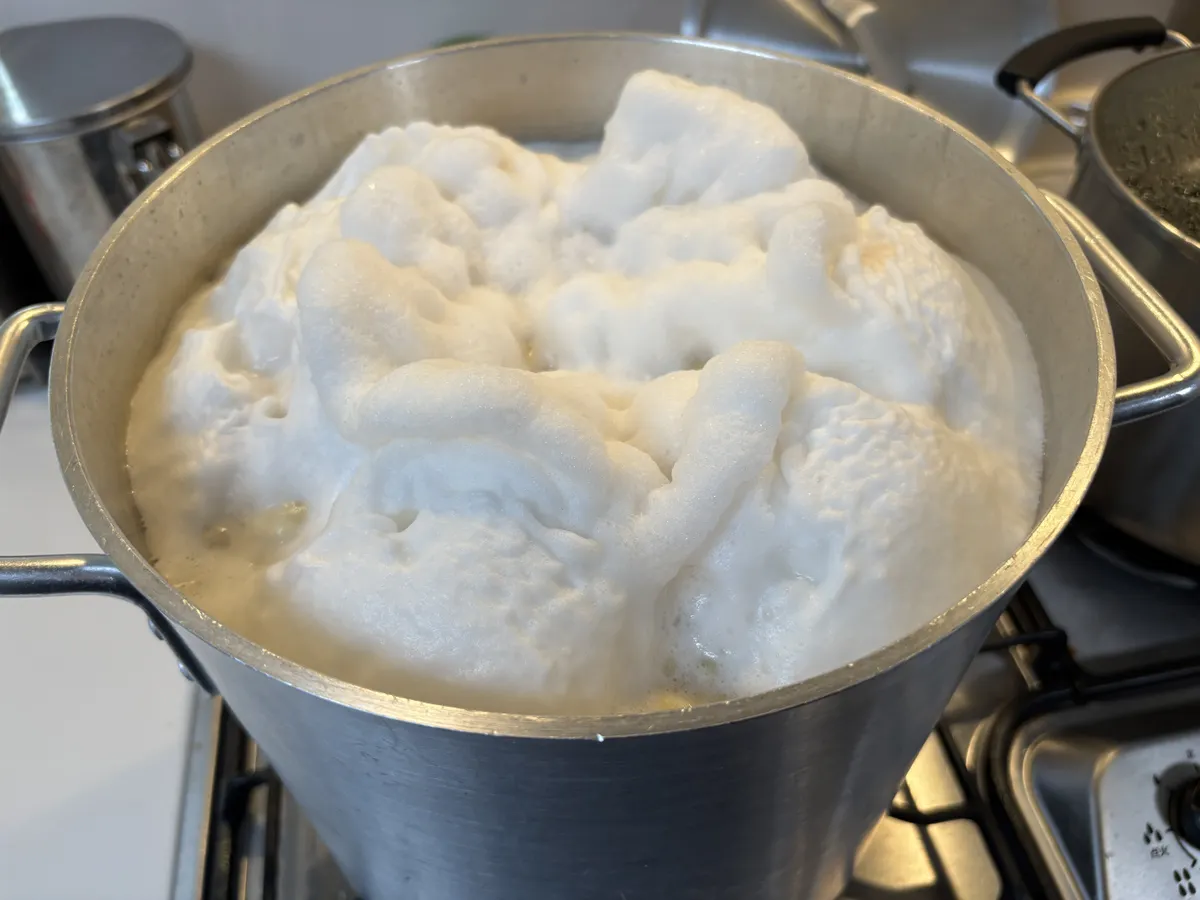 水を足して煮始め……最初の泡が収まってくれば、そう付きっきりで側に居なくても良いのですが、ガスコンロの温度センサーが時々気を利かせて火を止めてしまうので長時間離れる訳にはいかず、隣のダイニングテーブルで生協の注文用紙書いたり本を読んだりして過ごしました。