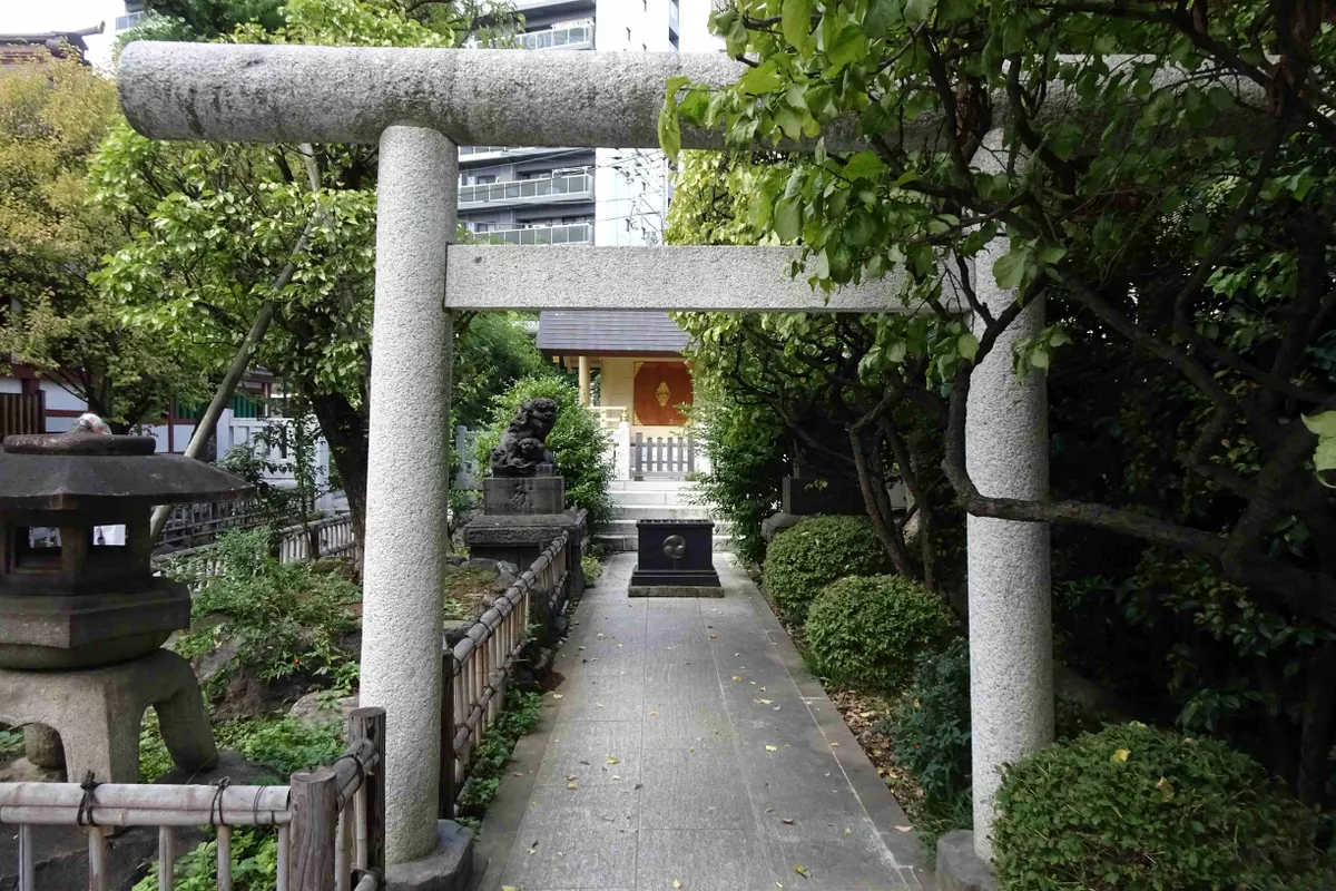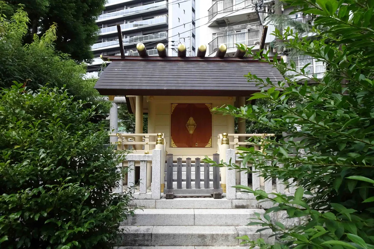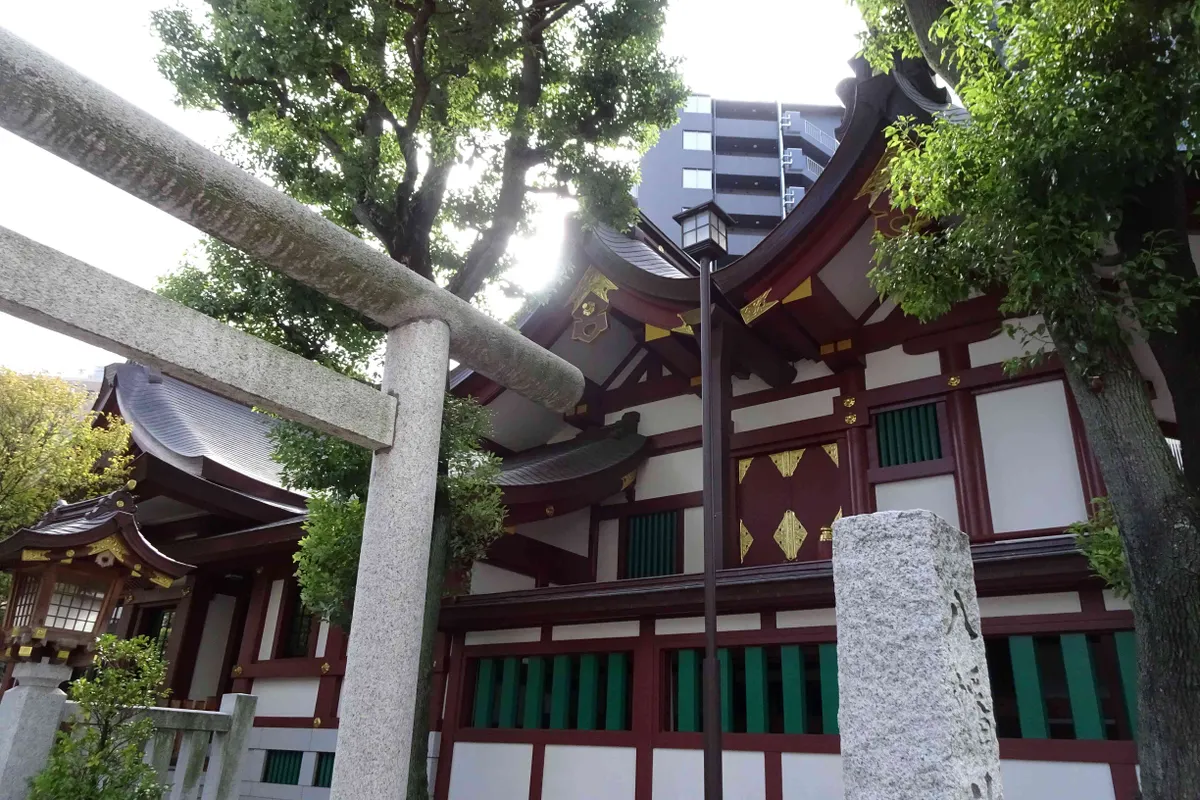 鳥居の奥に、変わった形の社殿が見えます。