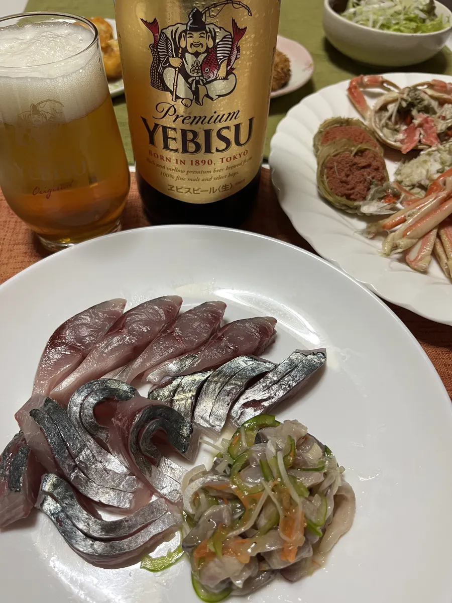今日の晩酌(晩ご飯)は 嫁と2人と言うことで いつものスーパー魚屋さんで 旬真っ只中のカニ🦀 (雌の香箱ガニですけどね😆)と 金沢港朝獲れ大ぶり鯵を購入♬ 🏠に帰りさっそく調理🔪 カニを食べやすく捌き 鯵は三枚におろして半身はお刺身に 残り半身はマリネにしました♬👇