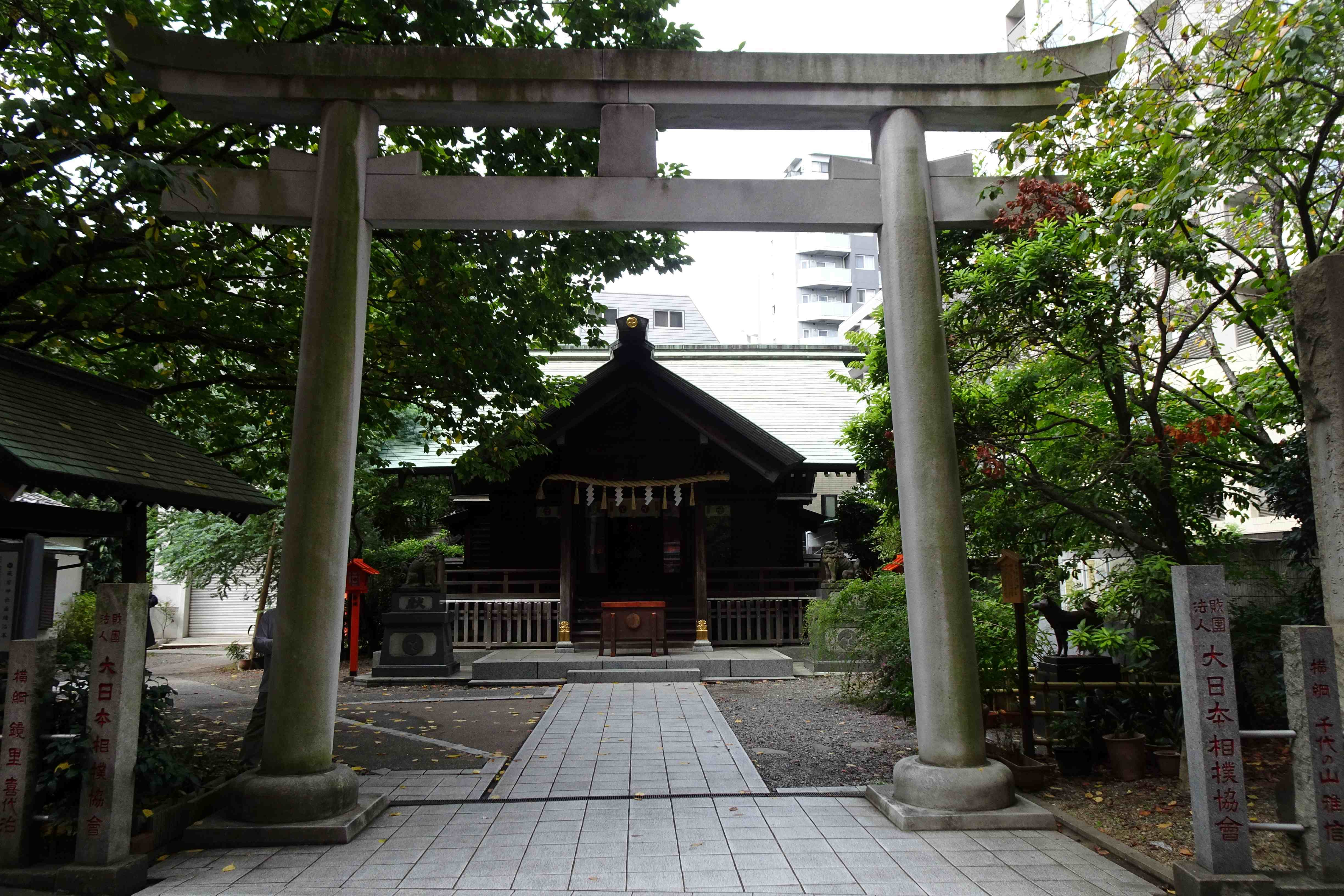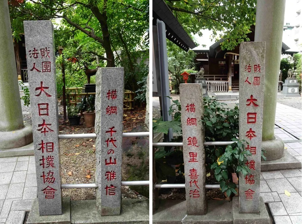 鳥居の前で神社の名を刻んだ大きな石碑は、日本相撲協会の寄進によるものでした。
