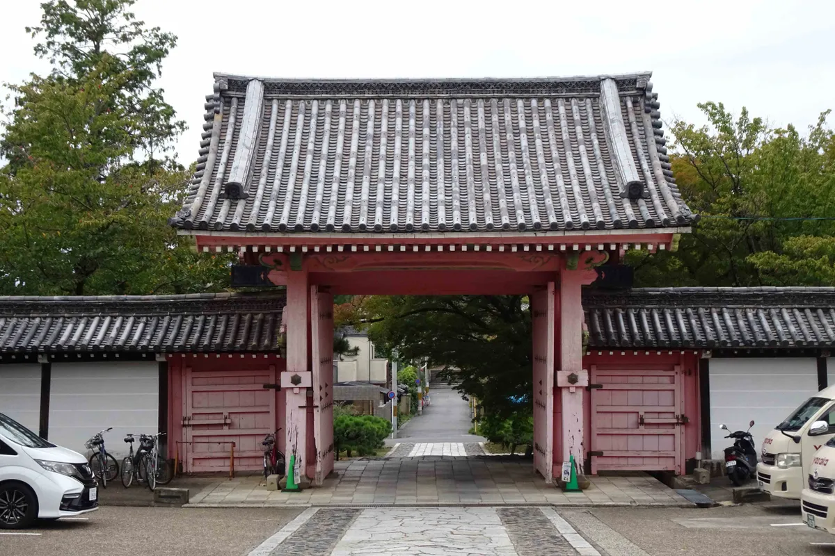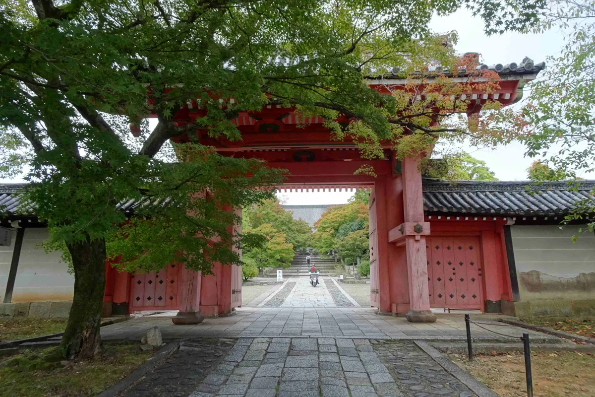 朱い総門をくぐると、木々の間に本堂が見えます。