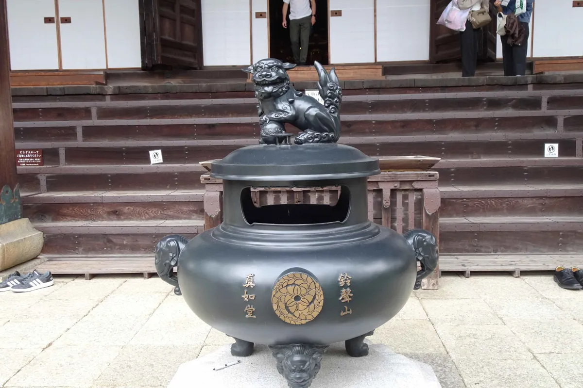 本堂前の香炉には、狛犬が載っていました。