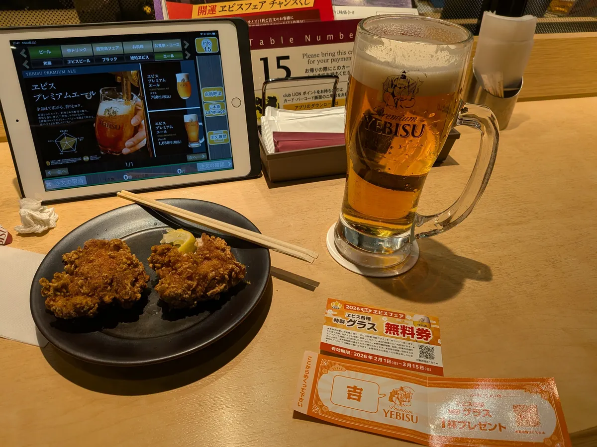 唐揚げ頼み、次はプレミアムエールのジョッキを!やった〜!チャンスハズレ引いておみくじをシャカシャカしてどりゃー‼️