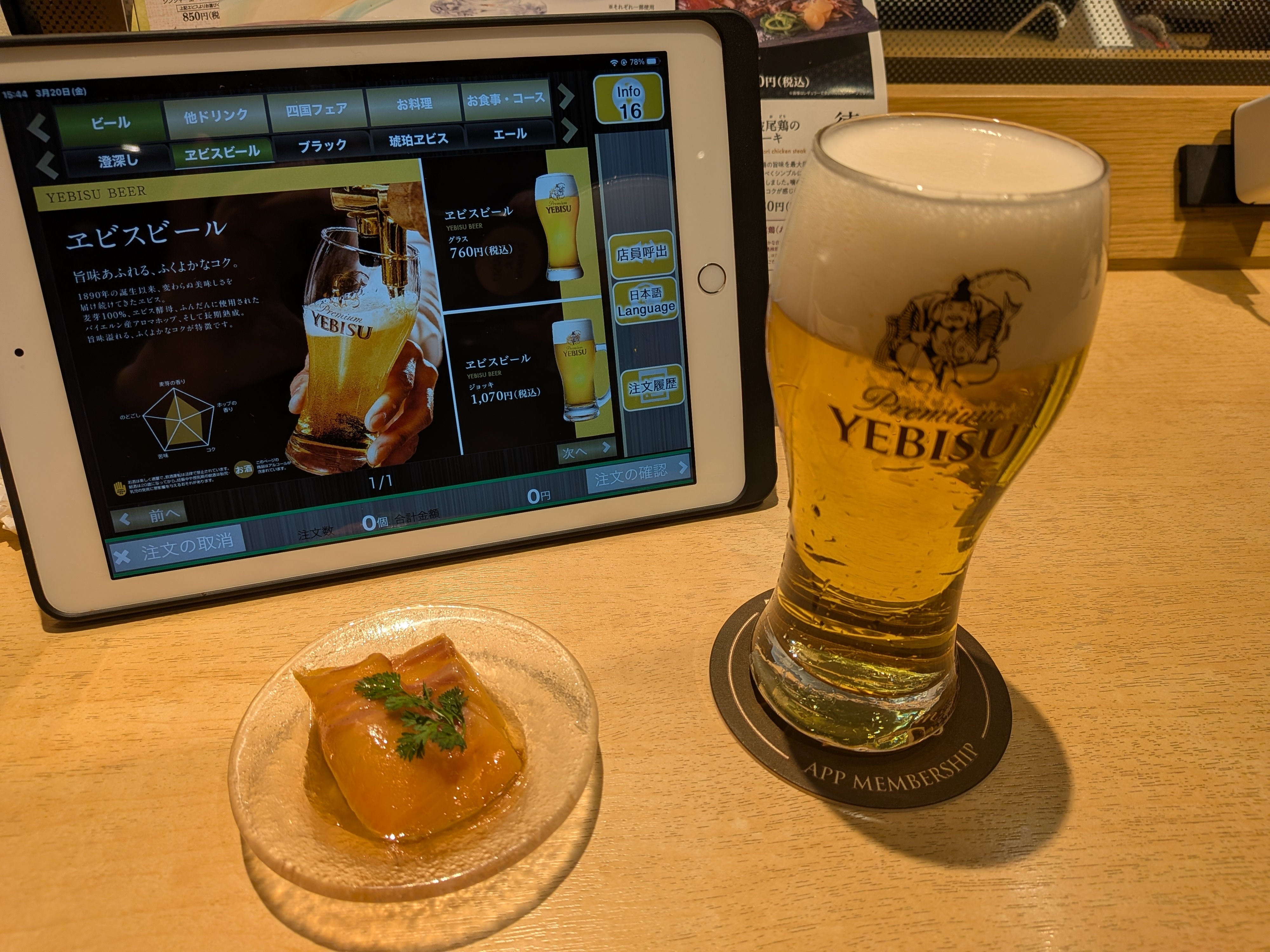 では基本に戻ってエビスバーで久々にいただく金エビスを…!&サーモン冷菜を…!😋
