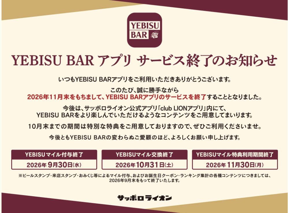 トップ > ヱビスフォト > YEBISU BAR > 始まりあれば終わりあり AREXS 2026/04/06 13:17 始まりあれば終わりあり YEBISU BAR アプリ終了のアナウンスは突然に YEBISU BAR カードからはじまり あまり使う機会なくアプリへ移行 たまにツマミや半額券に使う程度でしたが 終わるとなれば最終はヱビス1ケースで締め括りましょうか😮💨 終了までは今暫く楽しませて頂きましょうか🤔 銀座LIONアプリだけになるのもチョット淋しいですねぇ🥹 ヱビスビール いいね 共有する 共有する X facebook LINE リンクをコピー コメントする 2 件の返信 (新着順) ミュートしたユーザーの投稿です。 投稿を表示 rainbow🌈 2026/04/07 11:59 お誕生日や記念日特典って結構嬉しかったのですが・・・。 記念日(3月)はつい先日だったので妻を誘ってヱビスバー行きました🍻 悲しい事に私誕生日10月なのでギリギリ特典アウトになるようです🤣 とても残念な気分です😥 いいね 返信する ミュートしたユーザーの投稿です。 投稿を表示 春告花 2026/04/06 17:59 AREXSさん 突然の告知に驚いています 今後はクラブLIONアプリに一本化されるということのようですね 年に数回程度しか利用していませんがおみくじとビールスタンプは楽しんでいたので残念です ↓ お知らせより抜粋 いいね 返信する ミュートしたユーザーの投稿です。 投稿を表示 AREXS 2026/04/06 21:45 春告花さん 突然過ぎますよね😓 年末最終日までというならまだマシなのですが😅 いいね 返信する ミュートしたユーザーの投稿です。 投稿を表示 イワネ 2026/04/06 23:50 9月が誕生日なのでクーポンがギリで貰えるのが、かすかな慰めです😓 いいね 返信する ミュートしたユーザーの投稿です。 投稿を表示 AREXS 2026/04/07 01:10 イワネさん 自分も記念日と誕生日は終了までにクーポン貰えるタイミングです😅 いいね 返信する