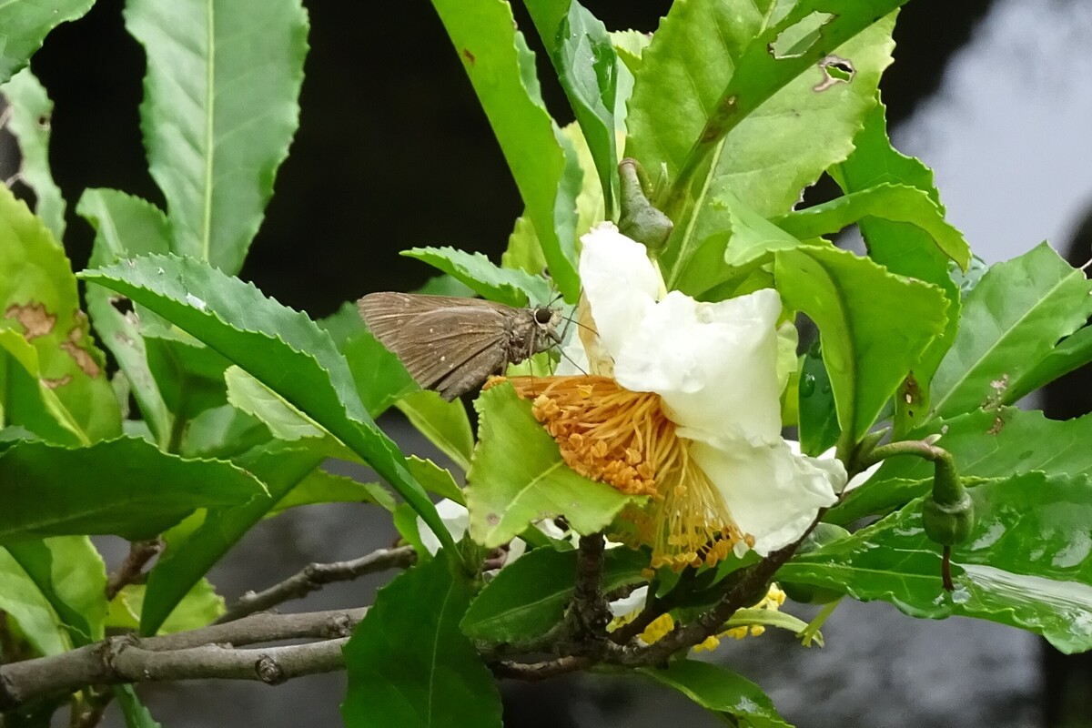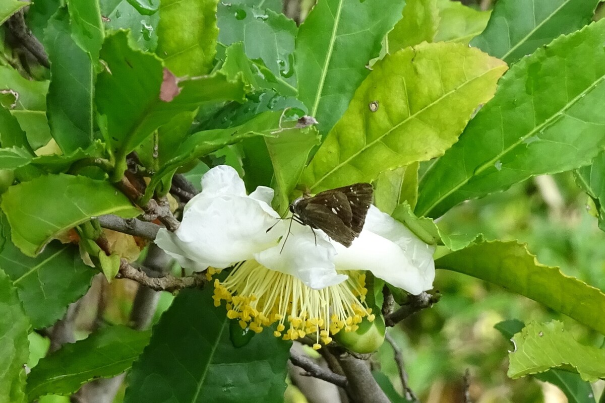 茶の木の花には、蝶が蜜を吸いに来ていました。