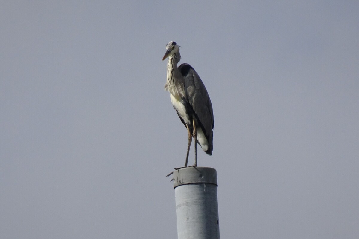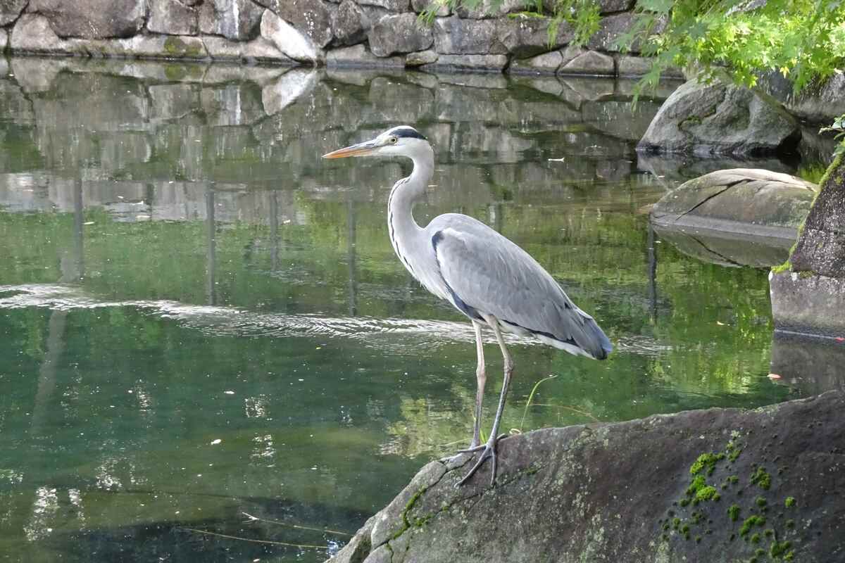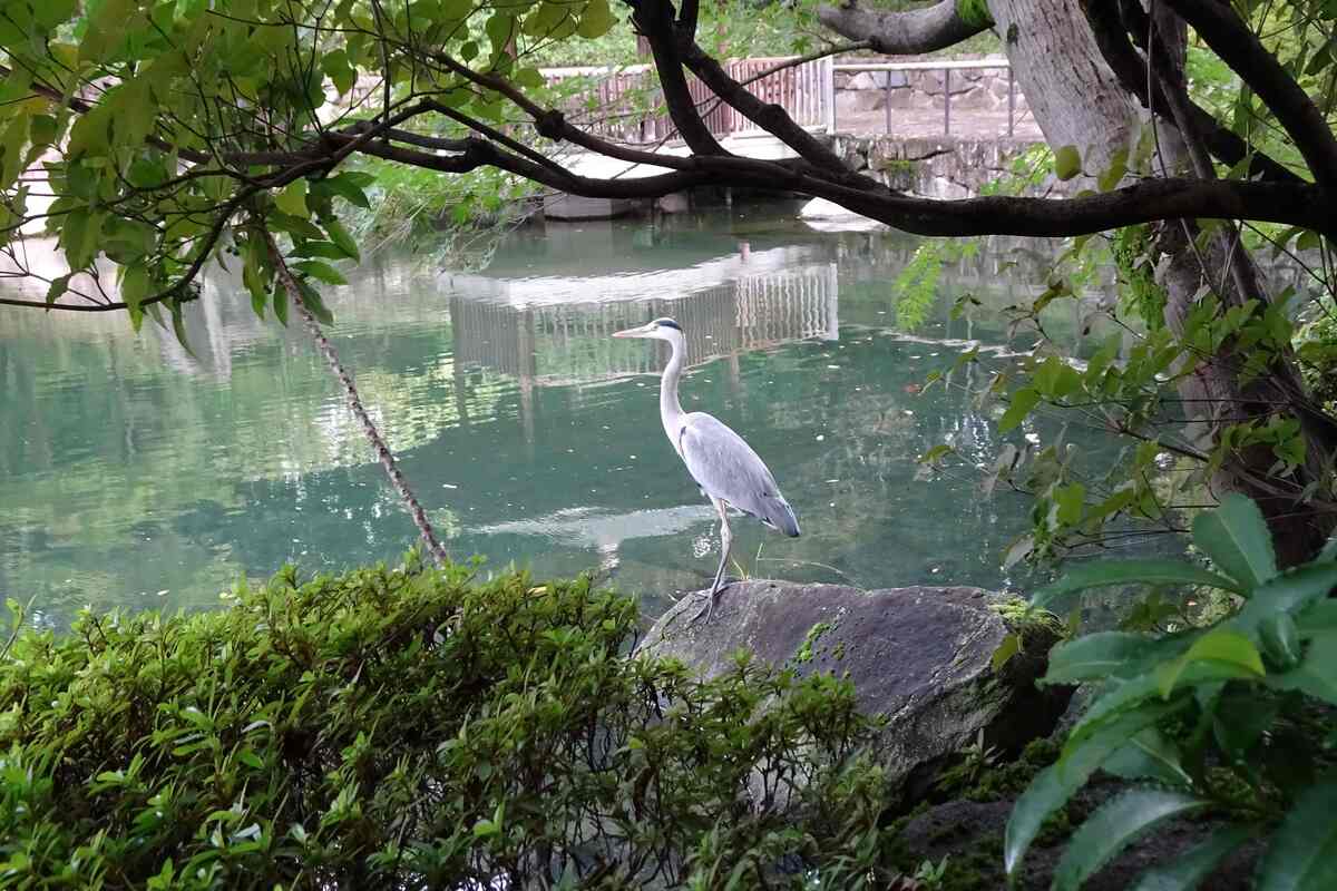 さっきまで電柱の上にいたアオサギ、羽を広げて池に降下してきたのですが、ちょうど赤鳥亭の下のベンチでぼ~としていたので、その場面は撮り損ねました。