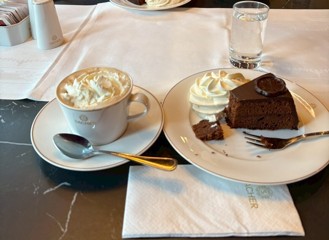 メランジェって何だろうと思ったら、日本でウインナーコーヒーって言っているものの本当の名前なんですね。本場のウインナーコーヒーにザッハトルテ……美味しそうです(´¬`)