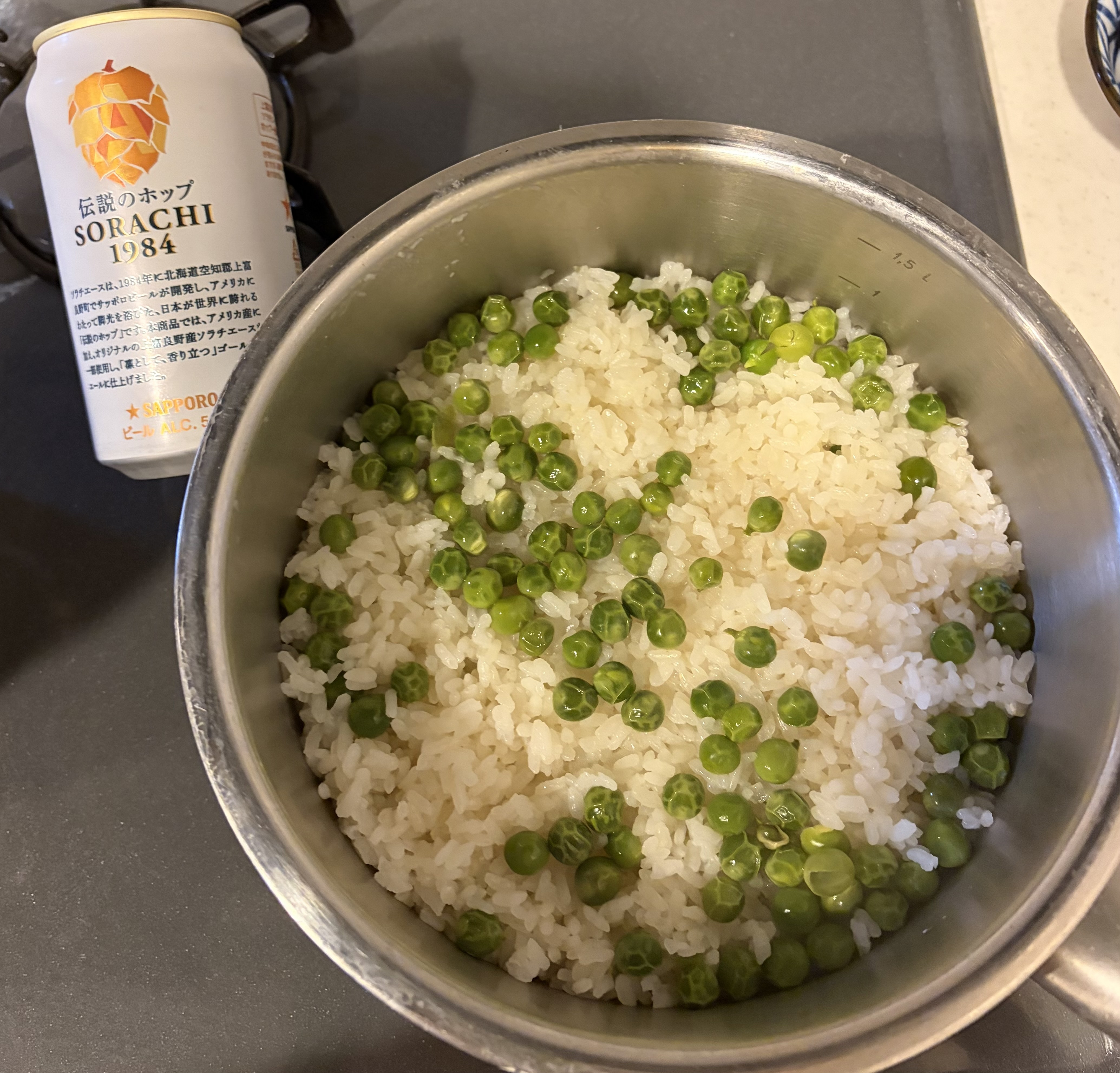 鍋で旬の豆🫛ごはん、美味しそうです🩷