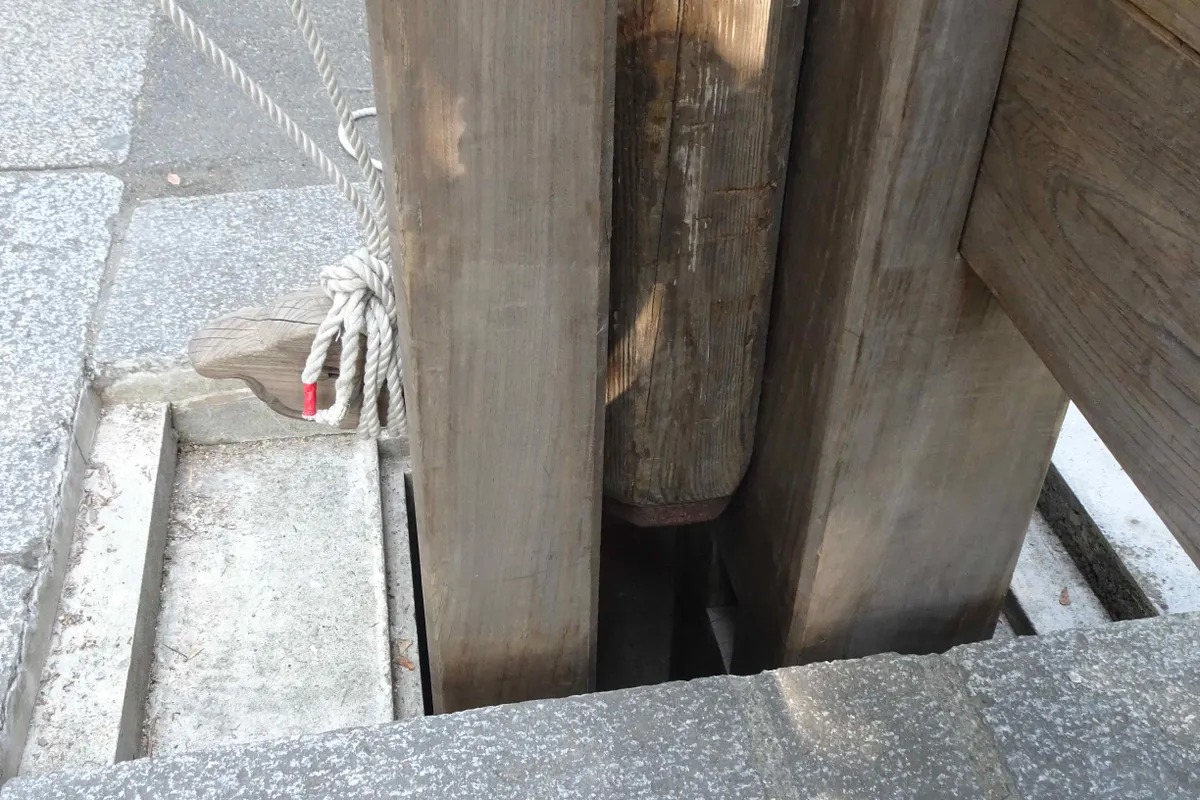 ちなみに、その高い木材をそのまま穴に差し込んで固定すると風で折れる可能性があるそうで、両側から別の木材で挟み込んで、宙に浮かせています。