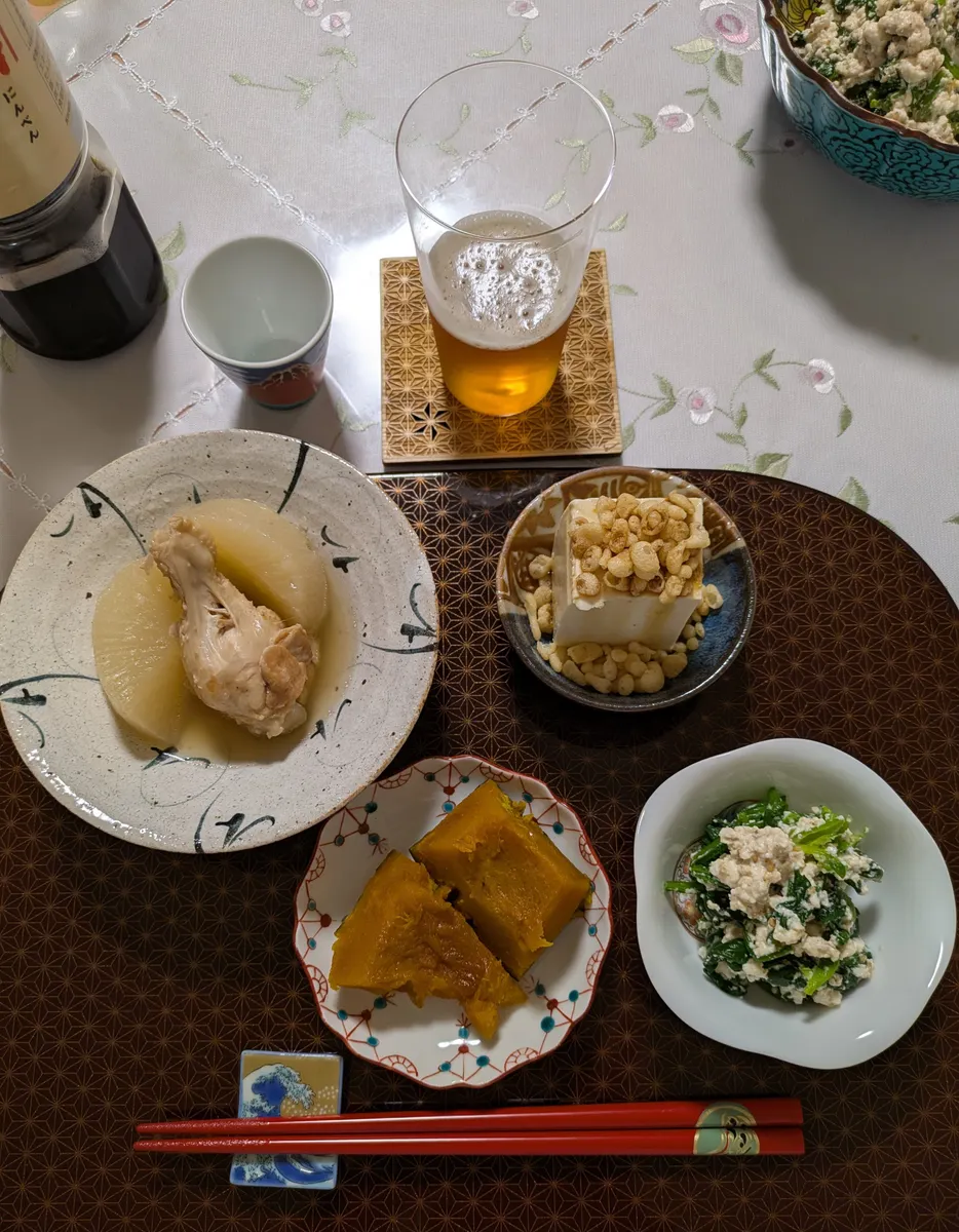 鶏手羽元と大根の煮物、ほうれん草の白和え、かぼちゃの煮物、冷奴