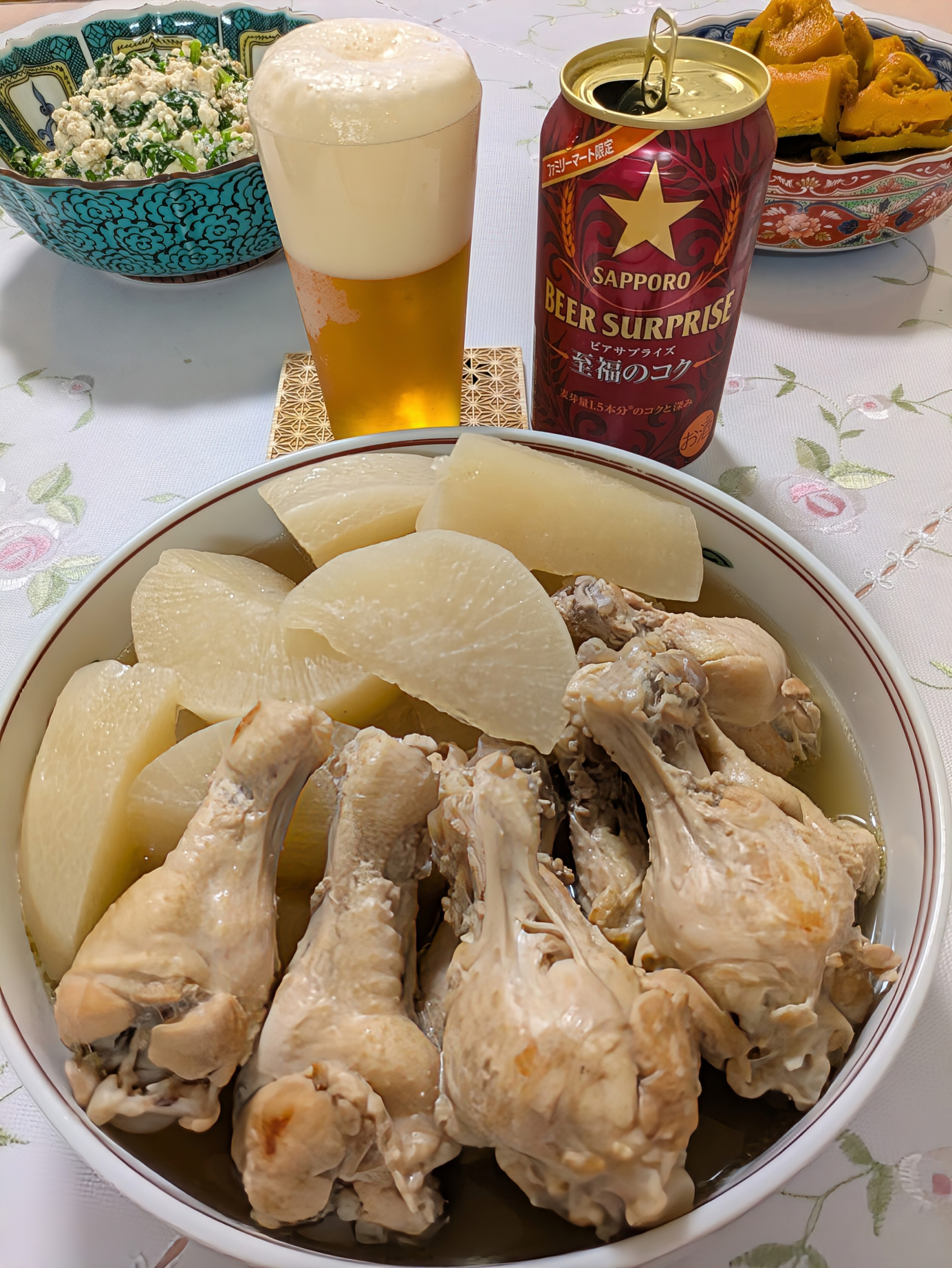 トップ > ヱビスフォト > グルメ・料理 > 至福のコク✕鶏手羽元と大根の煮物 マリリン 2025/11/27 07:58 至福のコク✕鶏手羽元と大根の煮物 至福のコクで乾杯🍻 寒くなると煮物も嬉しい~温まりますね 鶏手羽元と大根の煮物、ほうれん草の白和え、かぼちゃの煮物、そして冷奴を楽しみました 美味しかったです ご馳走さまでした🙏 そして今回の日本酒 賀茂鶴 にごり酒 広島県東広島市にある酒蔵、賀茂鶴酒造さんのお酒です すっきり爽やか甘口にごり酒。のとおり、すっきりした甘口の美味しいお酒です 至福のコク 鶏手羽元と大根の煮物 ほうれん草の白和え かぼちゃの煮物 冷奴 福寿 賀茂鶴にごり酒 冷奴は天かすにめんつゆをかけて 🍶が届くまであと一日。。 いいね 共有する 共有する X facebook LINE リンクをコピー コメントする 2 件の返信 (新着順) ミュートしたユーザーの投稿です。 投稿を表示 1107 kazu 2025/11/27 10:30 マリリンさん 鶏手羽元と大根の煮物、ほうれん草の白和え、かぼちゃの煮物、冷奴 どれも美味しそうです😋😍 小皿持ってお出かけ👜🍴✨しようかなぁ‼️ うふふ✨ヤー✨🍻🎶🍀👜🎵🍴✨ いいね 返信する ミュートしたユーザーの投稿です。 投稿を表示 あおちゃん 2025/11/27 08:20 手羽元、美味しいですね。 私も好きです。 いいね 返信する