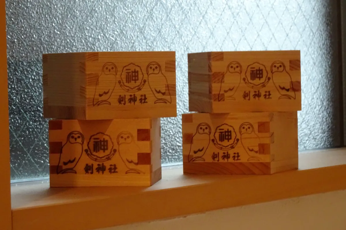 階段の途中の窓のところに、神社の紋章を刻んだ枡がありました。
