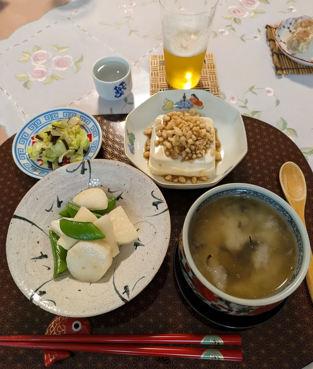 投稿を表示今日もまたどれも美味そうですね。特に、長芋とスナップエンドウの中華風塩炒めとカブラ蒸しが気になりました。このメニューの居酒屋、行ってみたいですよ、行けないけど🤣😎👍👏👏👏。