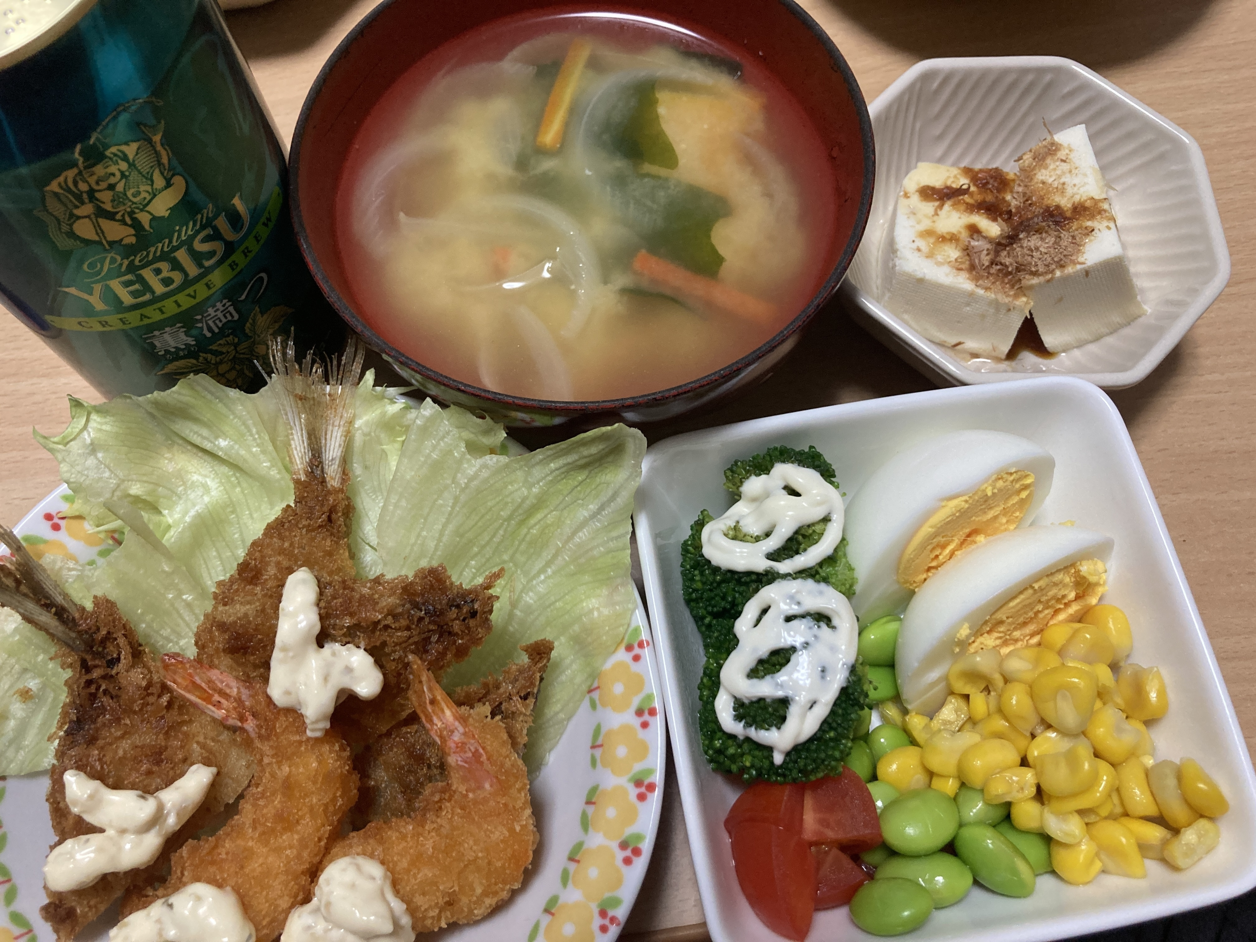 アジフライと小さいエビフライを買ってきて、サラダと味噌汁は作るパターン。昨夜も薫満つでいただきました。薫満つよりWHITE SUNのほうが合いそうですが、アジフライもエビフライも好きなメニュー。自分では作らないので、お惣菜コーナーはとてもありがたいです。どちらもタルタルソースでいただきました。ごちそうさまでした。