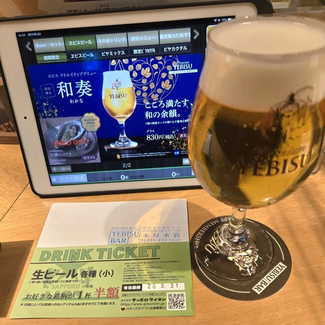 1枚ずつあった1月末日までのドリンク無料券と半額券を使いに行きました🍺