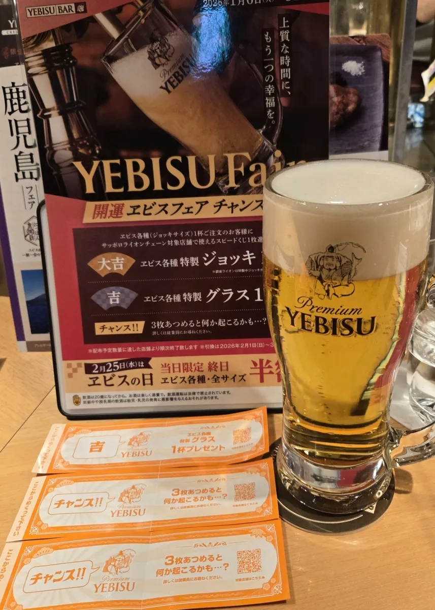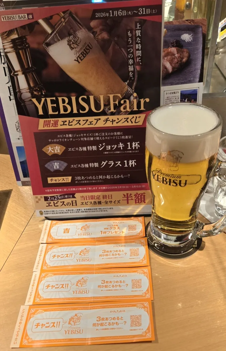 ここでも店長から、くじは最後ですよとサジェストされ、2杯目はヱビスビールジョッキを注文🍺見事に吉を引き当てる😊ところがスタッフさんと話が盛り上がり再びヱビスビールジョッキを注文😅くじはおかげさまでチャンス😆このチャンスを活かすか見捨てるかの選択に迫られる💦選択はヱビスビールジョッキのおかわり🤣くじは見事にチャンス券😅ここまできたら、あと一枚チャンス券が出るまで帰れまテン🍺そして再度ヱビスビールジョッキを注文🍺くじはチャンス券、見事にビンゴでした😅