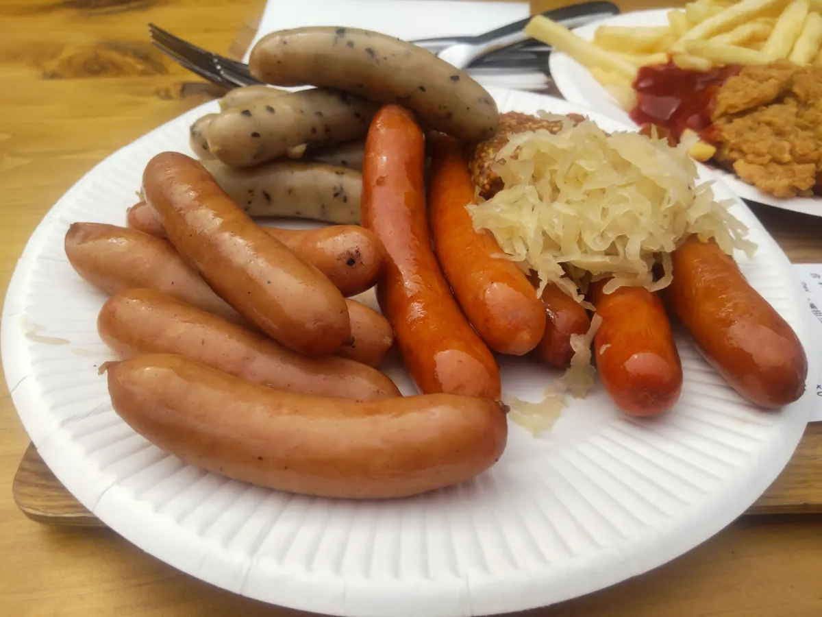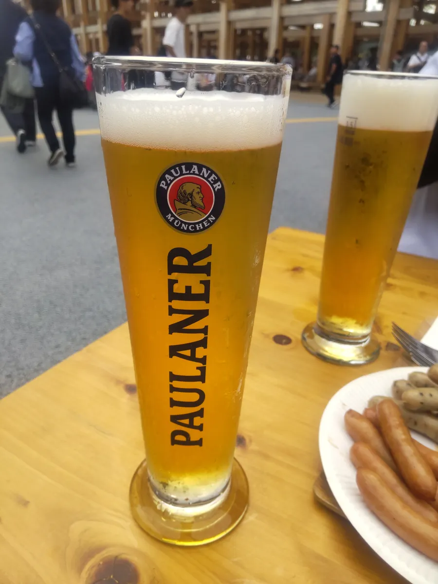 ウインナーソーセージはドイツ🇩🇪館かな?パウラナーミュンヘン(間違えていたらごめんなさい🙇) ビール琥珀色で グラスもカッコいいですね😊