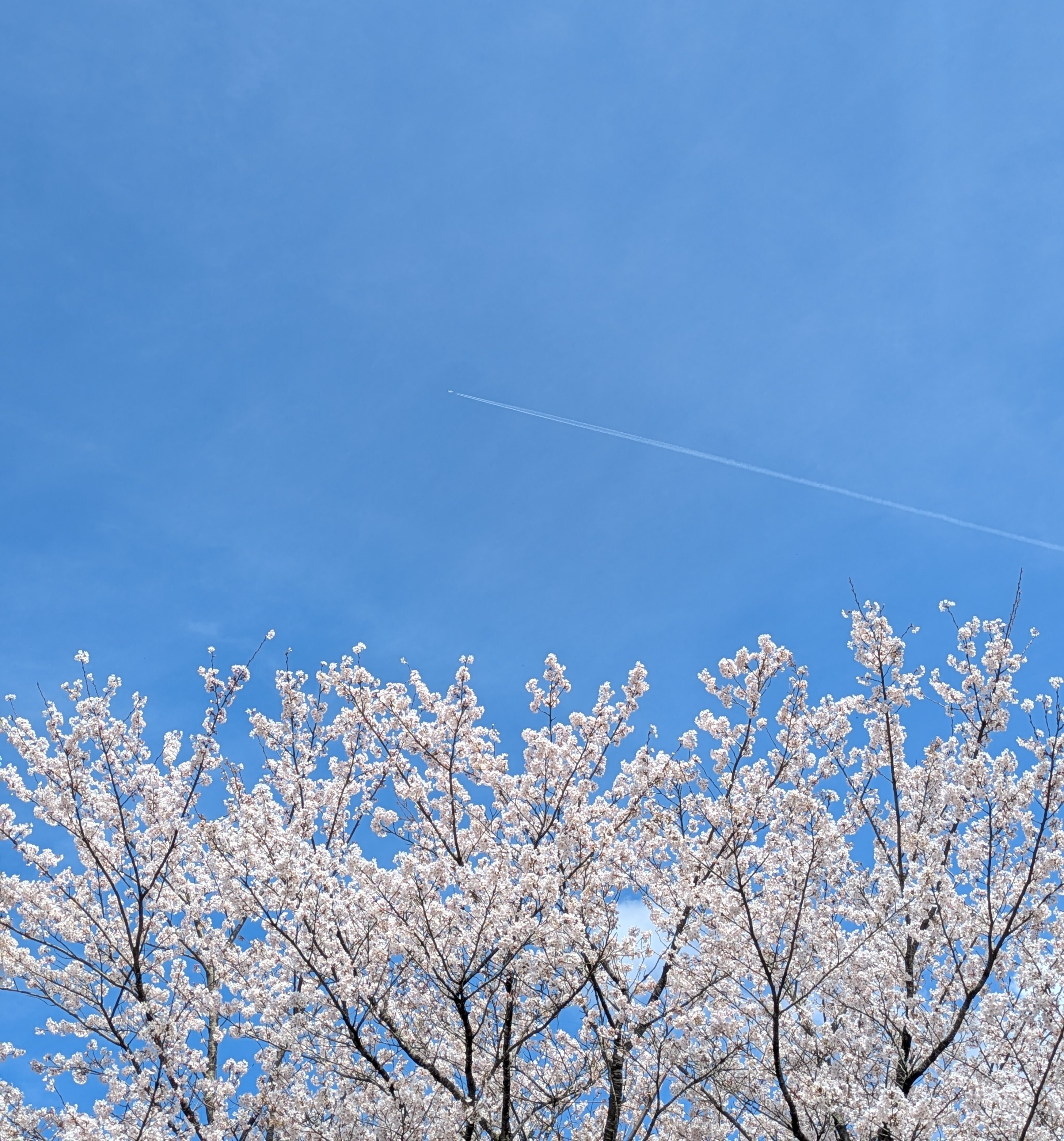 ちょっと花曇りの朝から抜けるような青空に変化した空。こんな空には、ピンクの桜🌸がよく似合います