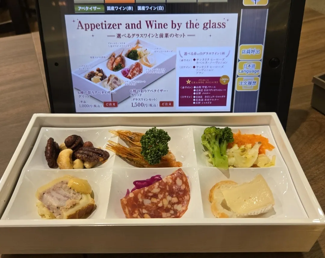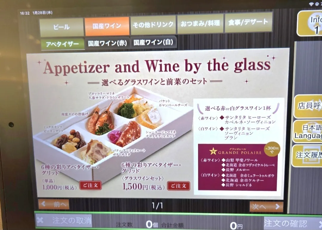タブレットを見たら店舗限定メニューですかね、他のライオンでは見たことのないワインの品揃えがあって、アペタイザーグリッド(前菜盛り合わせ)もありました。