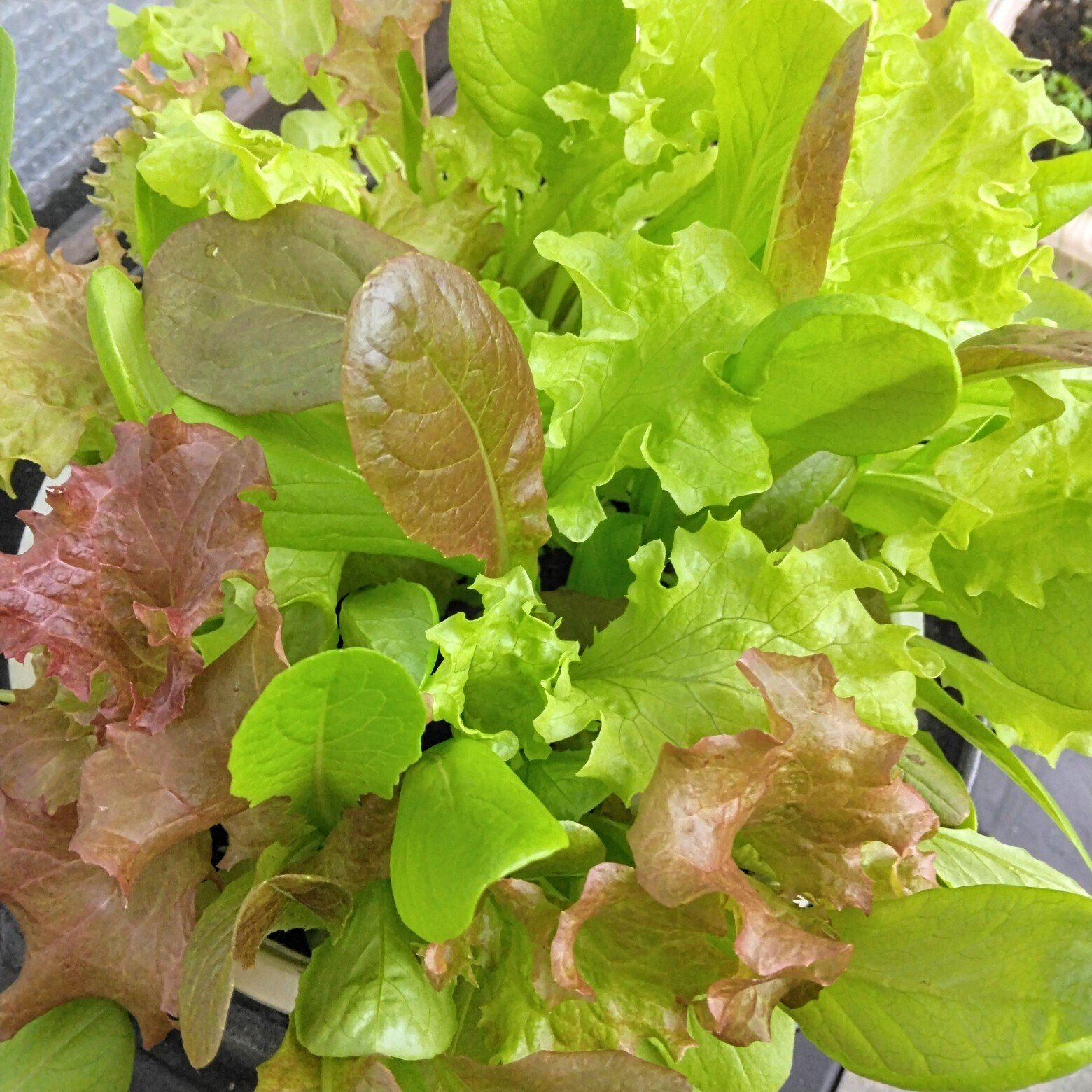 レタスミックス(ベビーリーフ)は、袋の中に5種類ぐらいのレタスの種が混ざっていて、適当にバラバラと蒔いたらすぐにすくすく伸びてくれる優れもの。昔ながらの言い方で言うところの「間引き菜」なので、晩ごはんのお皿に緑が足りないわって時にちょちょっと摘んで食べられるのが便利です。これがミニトマトとバジルの跡地に2鉢。