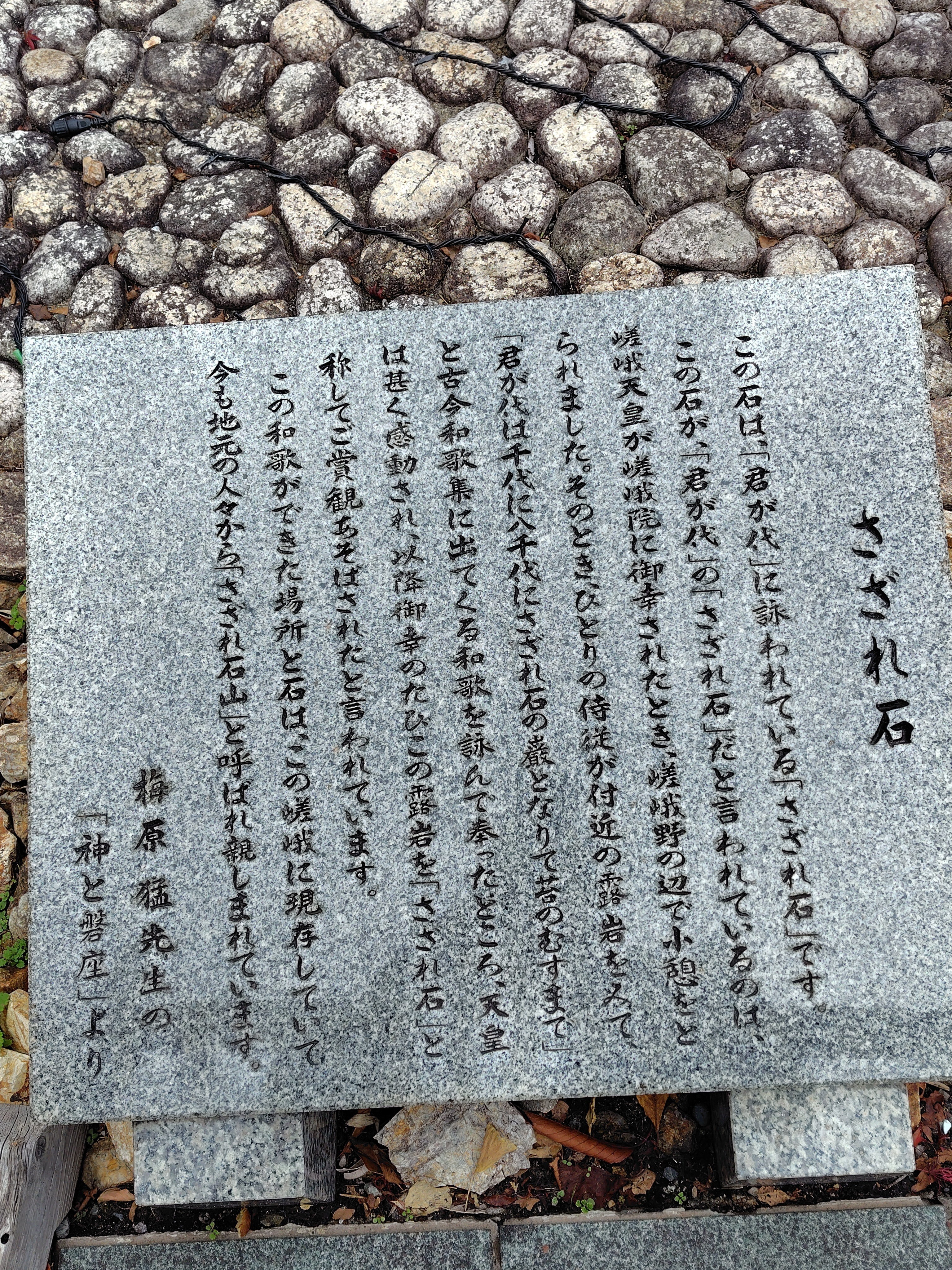 トップ > ヱビスフォト > さざれ石 (嵯峨嵐山) キティ74 2025/12/02 23:03 さざれ石 (嵯峨嵐山) 京都御所で雅楽を鑑賞したあとに初めて嵐山に行きました。 あの国の渡航自粛で少しはオーバーツーリズムが緩和してるかなと思ったのにあまり影響はないくらいの観光客の多さでした💦 君が代に詠われている「さざれ石」は嵯峨天皇が称されたと、この石板に記されています。 君が代は千代に八千代にさざれ石の巌となりて苔のむすまで (古今和歌集) さざれ石 嵯峨嵐山 嵯峨天皇 君が代 古今和歌集 24 いいね 共有する 共有する X facebook LINE リンクをコピー コメントする 1 件の返信 (新着順) ミュートしたユーザーの投稿です。 投稿を表示 ループトンネル 2025/12/03 06:18 勉強になります。 「国歌斉唱」のとき、「さざれ」と「石」とは、切らないで歌うべき…は知っていました。 そこの部分で息継ぎをする人の国家を聴くと、残念な気分になります。 いいね 返信する ミュートしたユーザーの投稿です。 投稿を表示 キティ74 2025/12/03 17:22 知らなかったけど、「さざれ〜い〜し〜の〜」と歌っていました。 いいね 返信する