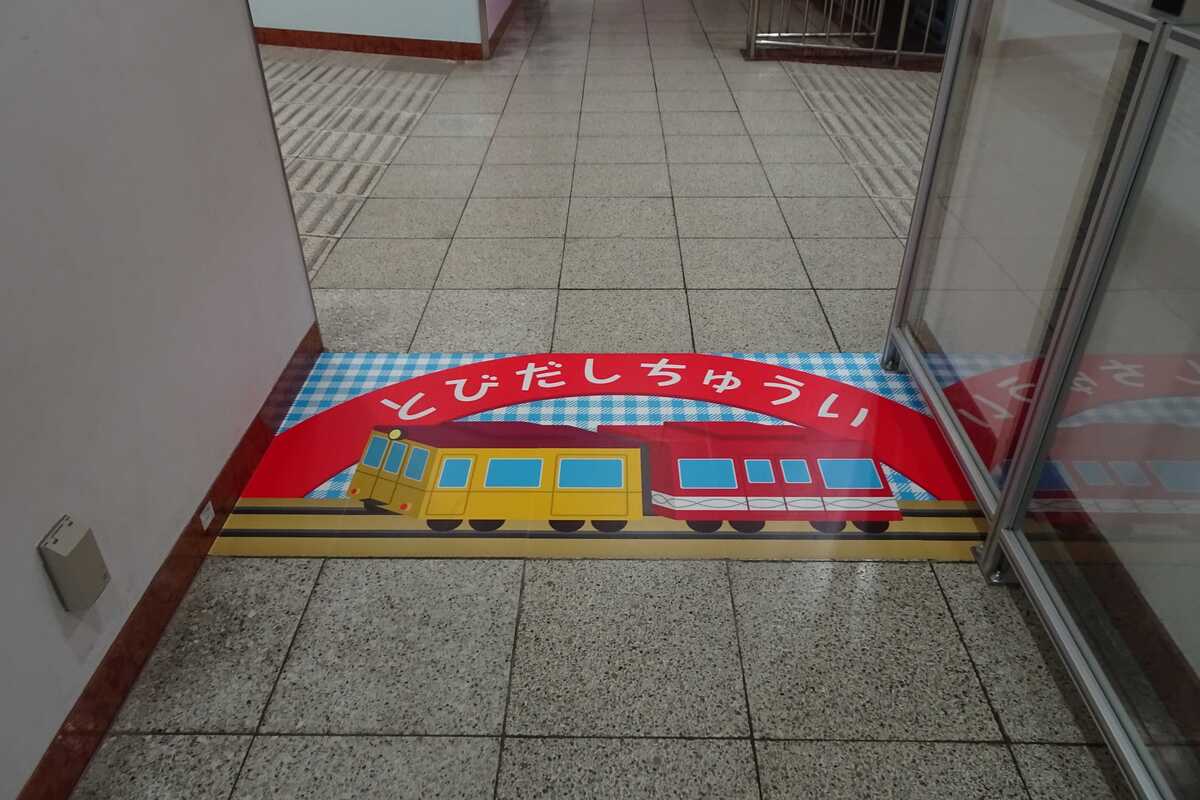 トイレに入って出てきたら、トイレから展示エリアへの飛び出しの注意書きもありました。