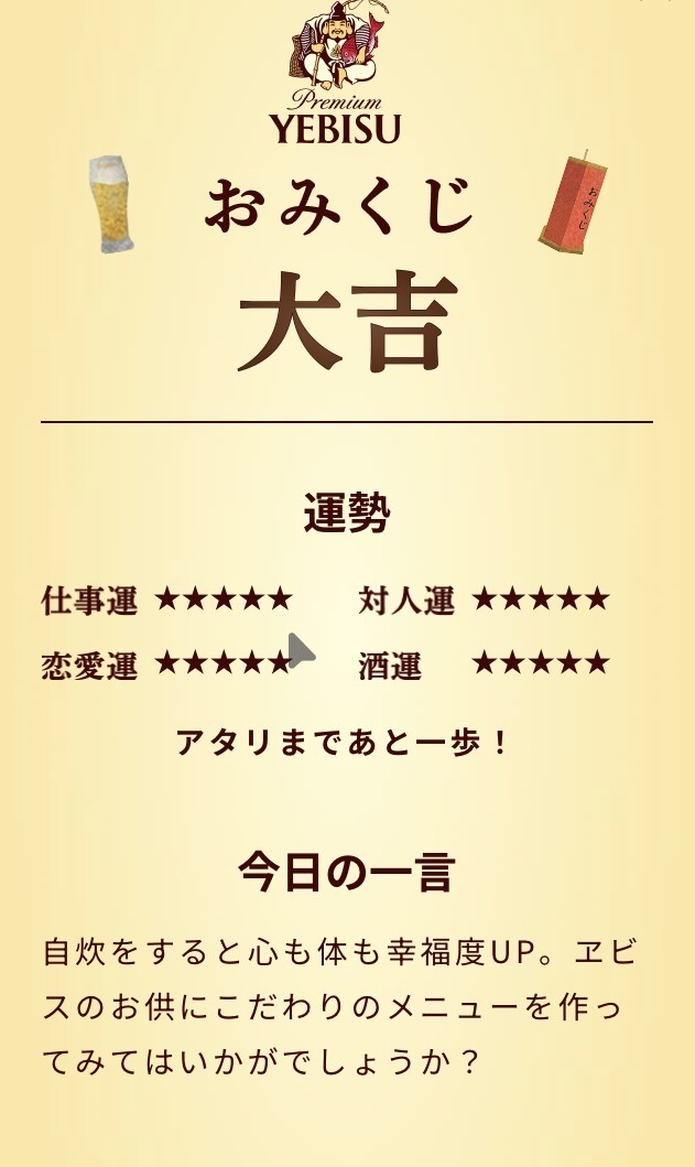 トップ > ヱビスフォト > 「大吉」 BIG 8 2026/01/28 10:32 「大吉」 ひさびさの「パーフェクト大吉」 きっといいことがありそう さあ、いい顔でいきましょう。 ヱビスビール いい顔 大吉 いいね 共有する 共有する X facebook LINE リンクをコピー コメントする 0 件の返信 (新着順)