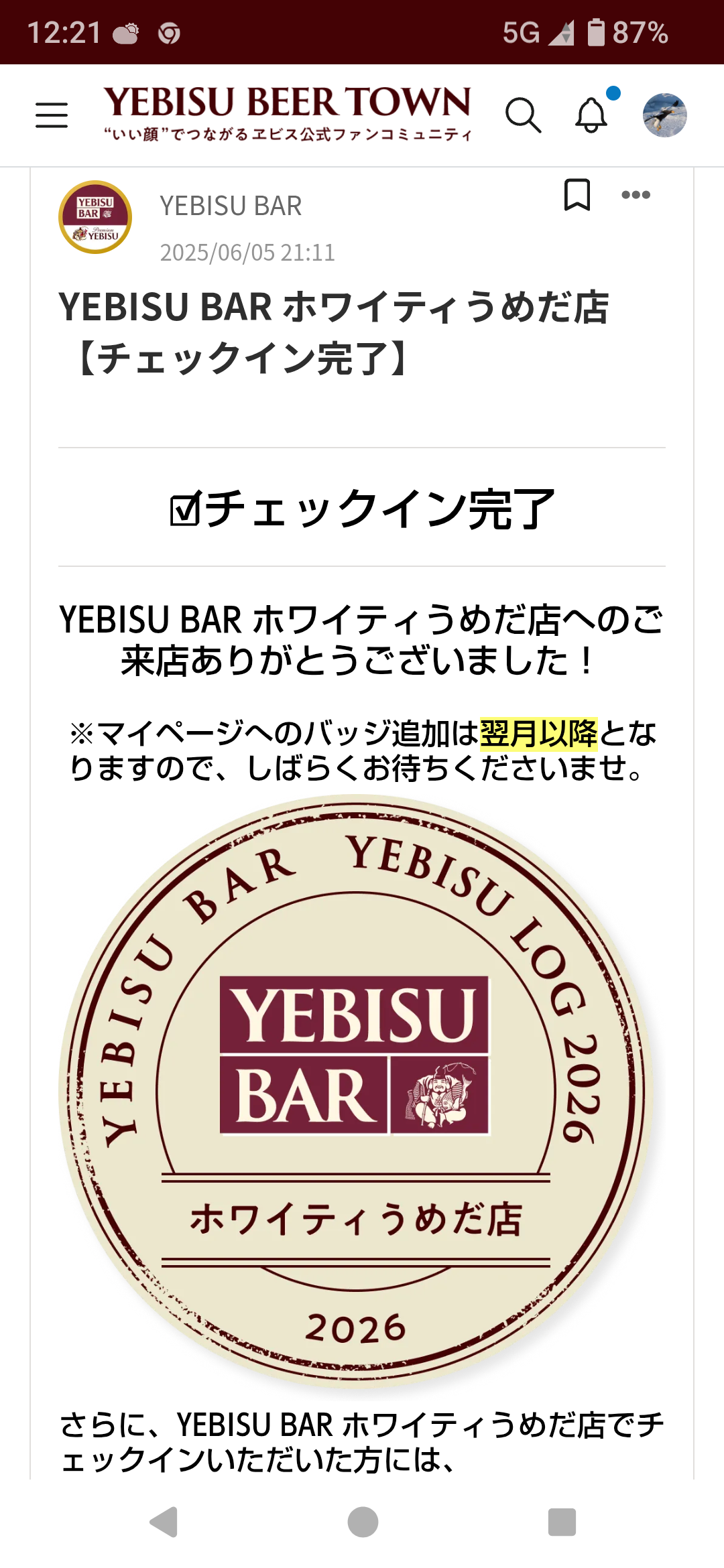 トップ > ヱビスフォト > YEBISU BAR > ハッピーアワーに澄深し🍺 monaka 2026/03/14 09:39 ハッピーアワーに澄深し🍺 一昨日・昨日のヱビバ関西5店舗巡り✈️ 〆の5店舗目はYEBISU BAR ホワイティ梅田店🚃 ハッピーアワーで澄深し🍺も500円❗🤩 そしてLINEお友だち新規追加特典で選べる冷菜(小皿)1皿プレゼントで、いぶりがっこのポテトサラダ🥔 もちろん目的のWバッジもゲット❗ 関西のヱビバ5店舗、Wバッジで計10個のバッジを滞りなくゲットできました😆 そして、この度のヱビバ関西5店舗巡り、ご一緒いただきましたTOWNのビア友の皆様ありがとうございました✨✨✨、大変楽しく乾杯できました🍻😊 ヱビバ関西5店舗巡り YEBISUBARホワイティ梅田店 ハッピーアワー 澄深し LINEお友だち新規追加特典 選べる冷菜(小皿)1皿プレゼント いぶりがっこのポテトサラダ Wバッジもゲット 関西ヱビバ5店舗のバッジ計10個ゲット ご一緒いただきましたTOWNのビア友の皆様ありがとうございました いいね 共有する 共有する X facebook LINE リンクをコピー コメントする 2 件の返信 (新着順) ミュートしたユーザーの投稿です。 投稿を表示 とらひっぽ 2026/03/15 12:58 monaka さま🙌 エビバ関西5店舗制覇、おめでとうございます🎊🎊 羨ましいです。。。🥹 関西、楽しいですよね🙌 夏休み🌻にトライしてみようかな、と いいね 返信する ミュートしたユーザーの投稿です。 投稿を表示 monaka 2026/03/15 13:19 とらひっぽさん ありがとうございます🙏 大阪のヱビバ気に入りました😊 大阪は近いので、今度は一人でゆっくり🍺巡りしてこようと思います🙋 いいね 返信する ミュートしたユーザーの投稿です。 投稿を表示 マリリン 2026/03/15 00:10 monakaさん、こんばんは ホワイティはハッピーアワーがあり、お得に飲めるのですよね~🤭 お~✨LINEの友達登録もされて、さらにお得に🥰 関西制覇、おめでとうございます✨👏👏👏 いいね 返信する ミュートしたユーザーの投稿です。 投稿を表示 monaka 2026/03/15 07:47 マリリンさん おはようございます🌞 昼飲みメインの自分にとってハッピーアワーのあるホワイティは天国に見えました👼 ありがとうございます🙏予定どおり関西5店舗巡り、そしてバッジ収集は完了しました😃 が、食べてみたいメニューもあるので、今度は一人でゆっくり🍺飲みに行こうかと思います😊 いいね 返信する