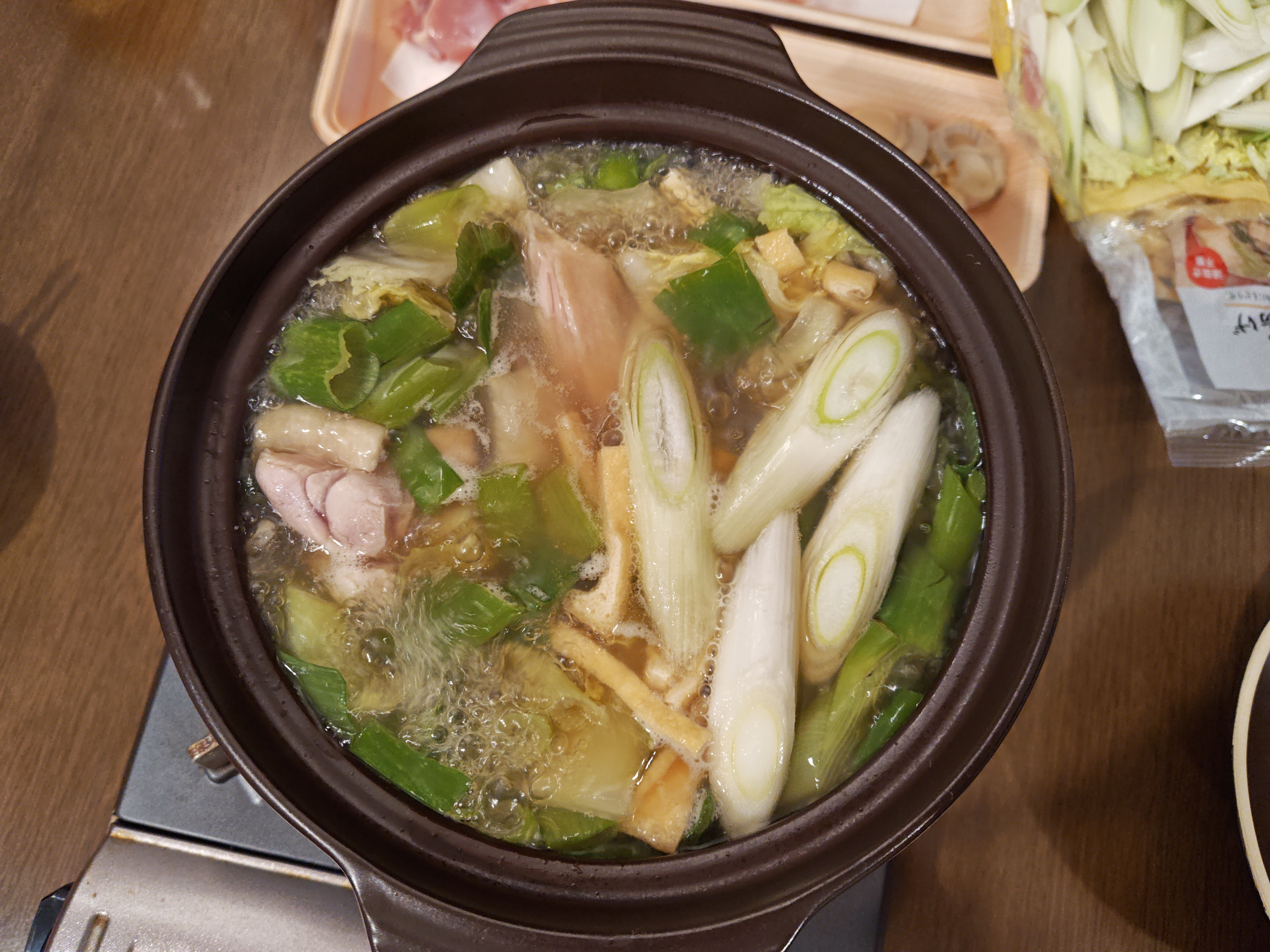 具材は鶏もも肉、鶏の手羽中、豚バラ、ホタテ、長葱、白菜、刻み揚げ🐔🐖🐚🥬🟨