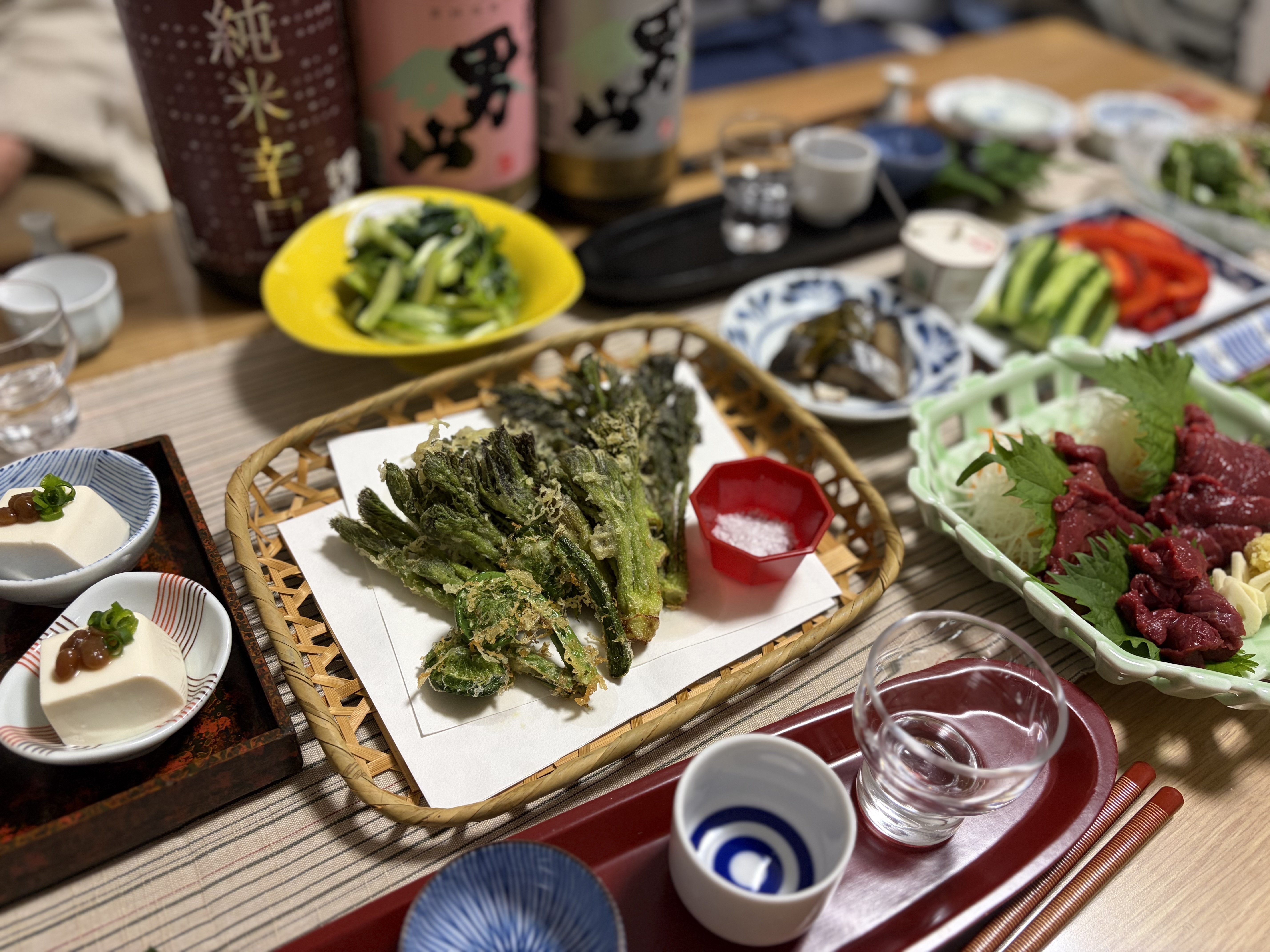 投稿を表示タラの芽天麩羅、馬刺し、男山🍶