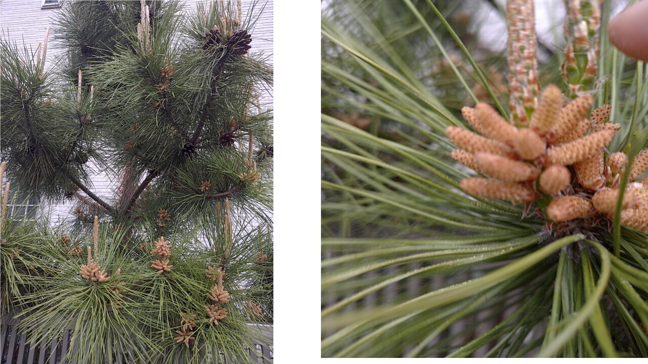 左:松が背よりも高く、幅もデカく成長し、いつも「チクチク刺さって邪魔!!」言われます(汗) 右:白いモンは全部花粉。分かるかな。松の葉に落ちた白い粉に注視(苦笑)