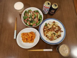 ある日の夕食〈138〉 回鍋肉キムチ入りポテトサラダロメインレタス・キュウリ・ベーコンのサラダ【お酒】サッポロ黒ラベルヱビス プレミアムブラック老松酒造 大分麦焼酎