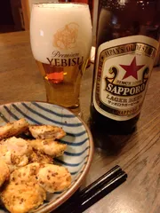 鶏のから揚げと赤星! 鶏のから揚げです。いつもと違う味付けで美味しかったです。