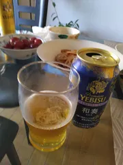エビとヱビ! エビのフリットのサラダにヱビスと和奏!🦐🥗横の袋はピン屋さんで買ったパニーニ🥪パンとビールって最高ですね😊おいしくいただきました〜🍺✨