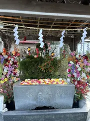 日光市今市は二宮尊徳の終焉の地で、そのお墓のある報徳二宮神社があります。アイキャッチ画像は一の鳥居で、下は二の鳥居ですが、その前の像が何かすごいです。二の鳥居に茅の輪です。鳥居に茅の輪って初めて見ました。手水舎ですが、柚子が飾られていました。またその左下には、可愛い花手水がありました。こちらが拝殿で