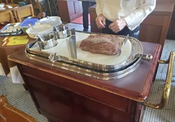 週末はやりませんけど、平日はローストビーフ焼き上がり時間に合わせて、料理長自ら客席にてローストビーフを切り分けます🐮基本は100gですけど、100gではちょっともの足りないので、ちょっとワガママ言って200gお願いできますか?とスタッフさんに聞いたら、料理長がテーブルまで来てくれて、口頭でこういう感