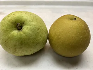 「かおり」と「カンタ」。 ひとの名前ぢゃありません。 ちゃんと実在する梨🍐の品種。 左の青いのが「かおり」。右の青茶色いのが「カンタ」。 「かおり」はまだまだデカいのが有るのだけれども、コイツはやや小ぶりなヤツ。 この「かおり」、和梨には珍しく「追熟」するのだ。