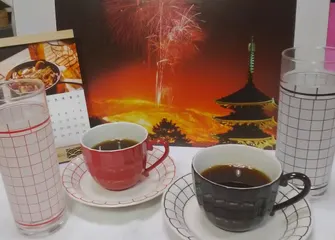 赤と黒のペアカップでコーヒーブレイク!誰かの文学小説に有った気が。「赤と黒」のコントラストが決まってるぅ~?!?