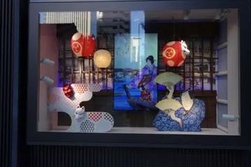 YUITOの裏側のショーウィンドウ 福徳神社のそばにあるYUITOの裏手のショーウィンドウが、浮世絵の絵柄を使ったなかなか風情のあるものでした。