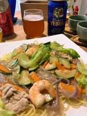 プレミアムエール🍺 × ニラ玉 × 焼きナス🍆 × えのきとピーマンとベーコンの炒め物🥓🫑✨
