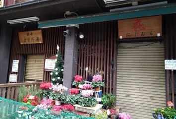 風呂屋と花屋のコラボ 名前は違うし、どういう関係なのでしょうか。風呂場のサウナの空気を温室に回しているとか・・・風呂屋側に寄せてそれとなくツリーが飾ってあるのが、どっちの店の客向けなのか疑問に思うところです。